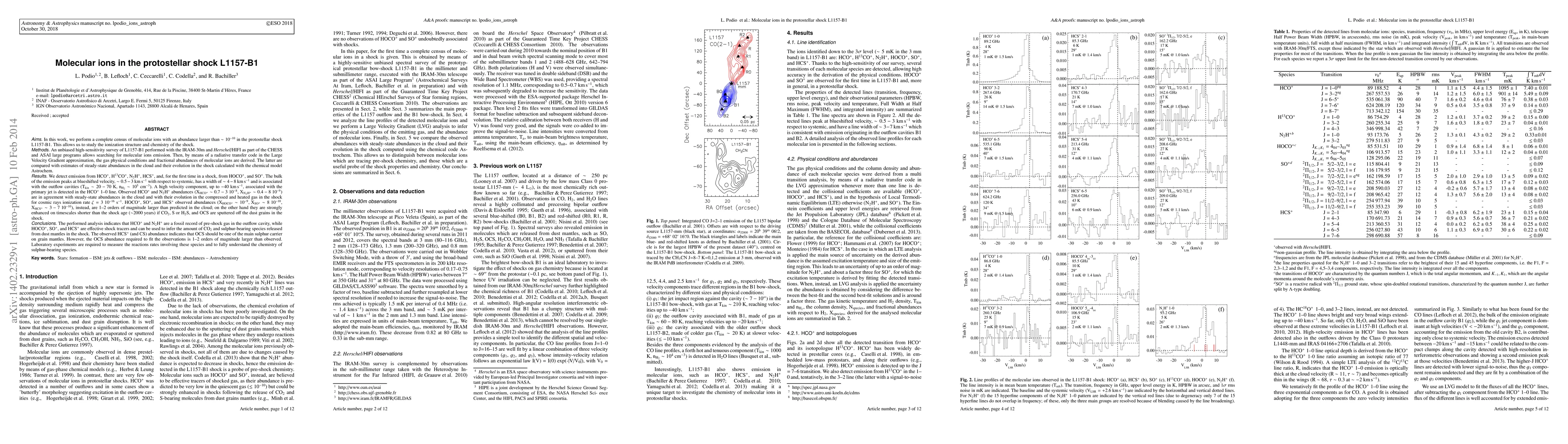 We perform a complete census of molecular ions with an abundance larger than 1e-10 in the protostellar shock L1157-B1 by means of an unbiased high-sensitivity survey obtained with the IRAM-30m and Herschel/HIFI. By means of an LVG radiative transfer code the gas physical conditions and fractional abundances of molecular ions are derived. The latter are compared with estimates of steady-state abundances in the cloud and their evolution in the shock calculated with the chemical model Astrochem. We detect emission from HCO+, H13CO+, N2H+, HCS+, and, for the first time in a shock, from HOCO+, and SO+. The bulk of the emission peaks at blueshifted velocity, ~ 0.5-3 km/s with respect to systemic, has a width of ~ 4-8 km/s, and is associated with the outflow cavities (T_kin ~ 20-70 K, n(H2) ~ 1e5 cm-3). Observed HCO+ and N2H+ abundances are in agreement with steady-state abundances in the cloud and with their evolution in the compressed and heated gas in the shock for cosmic rays ionization rate Z = 3e-16 s-1. HOCO+, SO+, and HCS+ observed abundances, instead, are 1-2 orders of magnitude larger than predicted in the cloud; on the other hand they are strongly enhanced on timescales shorter than the shock age (~2000 years) if CO2, S or H2S, and OCS are sputtered off the dust grains in the shock. The performed analysis indicates that HCO+ and N2H+ are a fossil record of pre-shock gas in the outflow cavity, while HOCO+, SO+, and HCS+ are effective shock tracers and can be used to infer the amount of CO2 and sulphur-bearing species released from dust mantles in the shock. The observed HCS+ (and CS) abundance indicates that OCS should be one of the main sulphur carrier on grain mantles. However, the OCS abundance required to fit the observations is 1-2 orders of magnitude larger than observed. Further studies are required to fully understand the chemistry of sulphur-bearing species.