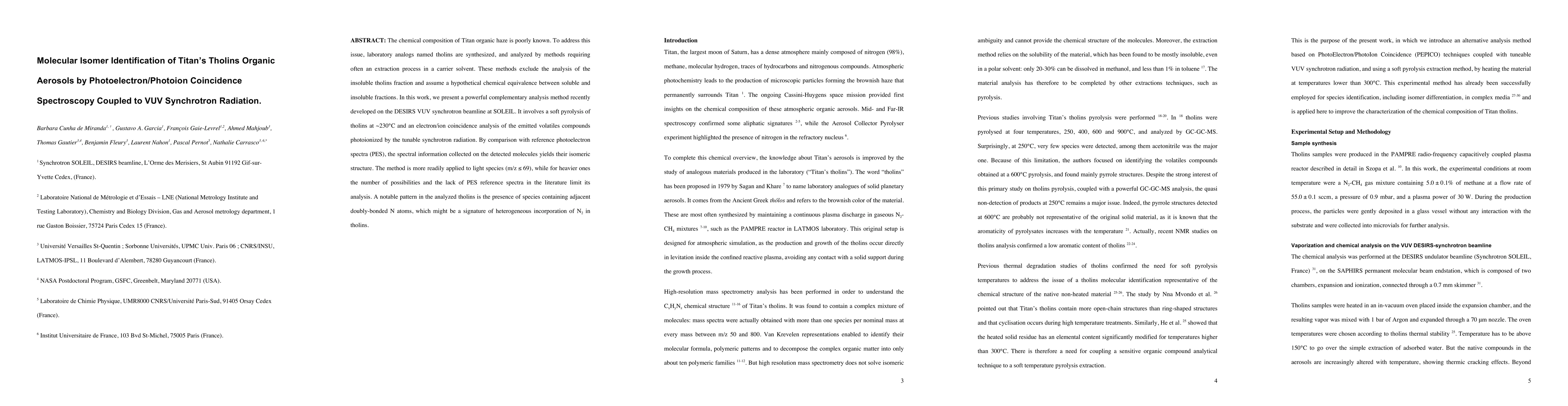 This study introduces a novel method using photoelectron/photoion coincidence spectroscopy coupled with VUV synchrotron radiation to identify molecular isomers in Titan tholins organic aerosols, revealing the presence of species with adjacent doubly-bonded nitrogen atoms, potentially indicating N2 incorporation. The method offers a complementary approach to traditional extraction-based techniques, though it faces limitations for heavier species.