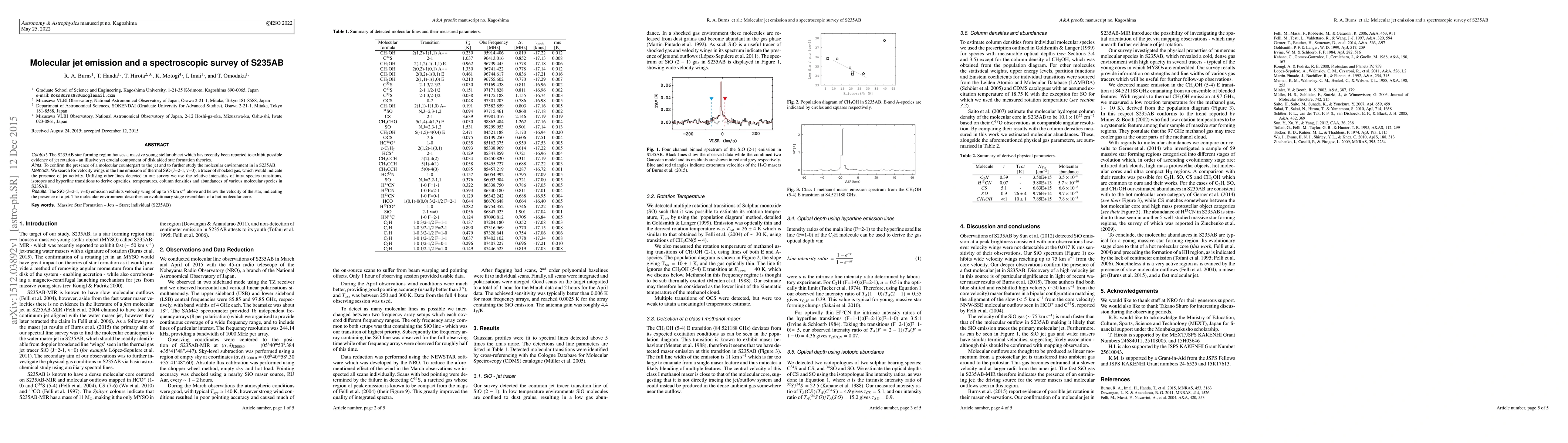 Context. The S235AB star forming region houses a massive young stellar object which has recently been reported to exhibit possible evidence of jet rotation - an illusive yet crucial component of disk aided star formation theories. Aims. To confirm the presence of a molecular counterpart to the jet and to further study the molecular environment in in S235AB. Methods. We search for velocity wings in the line emission of thermal SiO (J=2-1, v=0), a tracer of shocked gas, which would indicate the presence of jet activity. Utilising other lines detected in our survey we use the relative intensities of intra species transitions, isotopes and hyperfine transitions to derive opacities, temperatures, column densities and abundances of various molecular species in S235AB. Results. The SiO (J=2-1, v=0) emission exhibits velocity wing of up to 75 km/s above and below the velocity of the star, indicating the presence of a jet. The molecular environment describes an evolutionary stage resemblant of a hot molecular core.