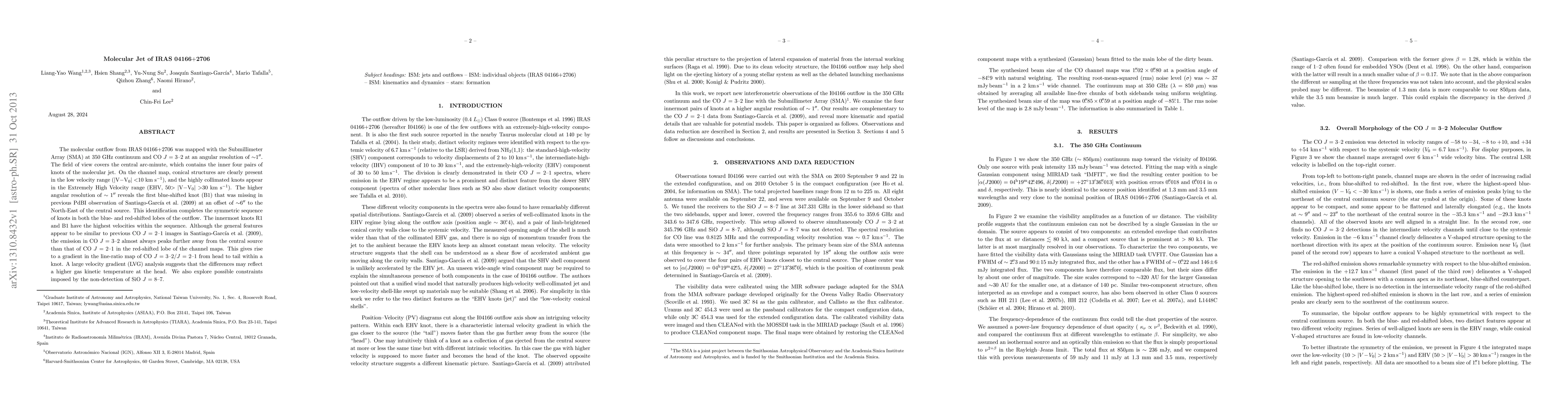 The molecular outflow from IRAS 04166+2706 was mapped with the Submillimeter Array (SMA) at 350 GHz continuum and CO J = 3$-$2 at an angular resolution of ~1 arcsec. The field of view covers the central arc-minute, which contains the inner four pairs of knots of the molecular jet. On the channel map, conical structures are clearly present in the low velocity range (|V$-$V$_0$|$<$10 km s$^{-1}$), and the highly collimated knots appear in the Extremely High Velocity range (EHV, 50$>$|V$-$V$_0$|$>$30 km s$^{-1}$). The higher angular resolution of ~1 arcsec reveals the first blue-shifted knot (B1) that was missing in previous PdBI observation of Sant\'iago-Garc\'ia et al. (2009) at an offset of ~6 arcsec to the North-East of the central source. This identification completes the symmetric sequence of knots in both the blue- and red-shifted lobes of the outflow. The innermost knots R1 and B1 have the highest velocities within the sequence. Although the general features appear to be similar to previous CO J = 2$-$1 images in Sant\'iago-Garc\'ia et al. (2009), the emission in CO J = 3$-$2 almost always peaks further away from the central source than that of CO J = 2$-$1 in the red-shifted lobe of the channel maps. This gives rise to a gradient in the line-ratio map of CO J = 3$-$2/J = 2$-$1 from head to tail within a knot. A large velocity gradient (LVG) analysis suggests that the differences may reflect a higher gas kinetic temperature at the head. We also explore possible constraints imposed by the non-detection of SiO J = 8$-$7.