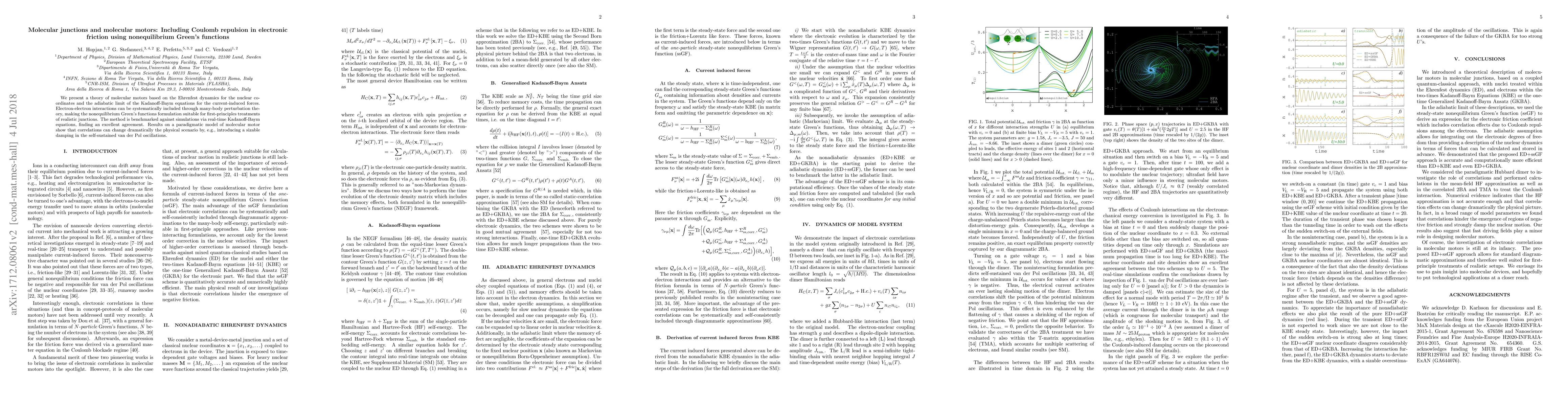 We present a theory of molecular motors based on the Ehrenfest dynamics for the nuclear coordinates and the adiabatic limit of the Kadanoff-Baym equations for the current-induced forces. Electron-electron interactions can be systematically included through many-body perturbation theory, making the nonequilibrium Green's functions formulation suitable for first-principles treatments of realistic junctions. The method is benchmarked against simulations via real-time Kadanoff-Baym equations, finding an excellent agreement. Results on a paradigmatic model of molecular motor show that correlations can change dramatically the physical scenario by, e.g. introducing a sizable damping in the self-sustained van der Pol oscillations.