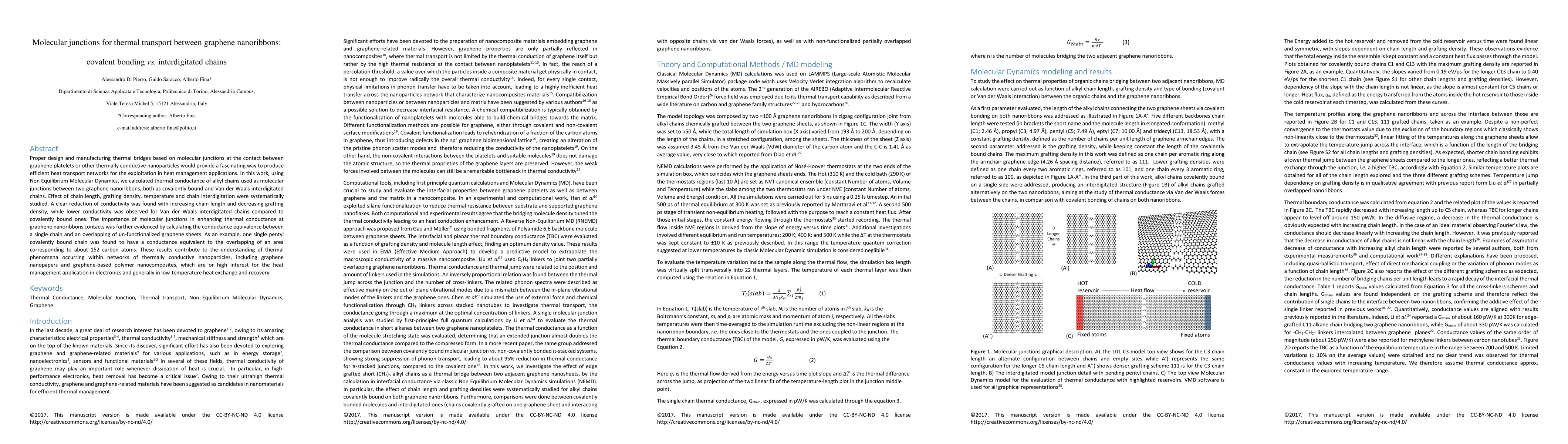 This study investigates thermal conductance in molecular junctions between graphene nanoribbons using Non Equilibrium Molecular Dynamics. It compares covalently bonded and Van der Waals interdigitated alkyl chains, finding that covalent bonds yield higher thermal conductance, with longer chains and lower grafting densities reducing conductivity.