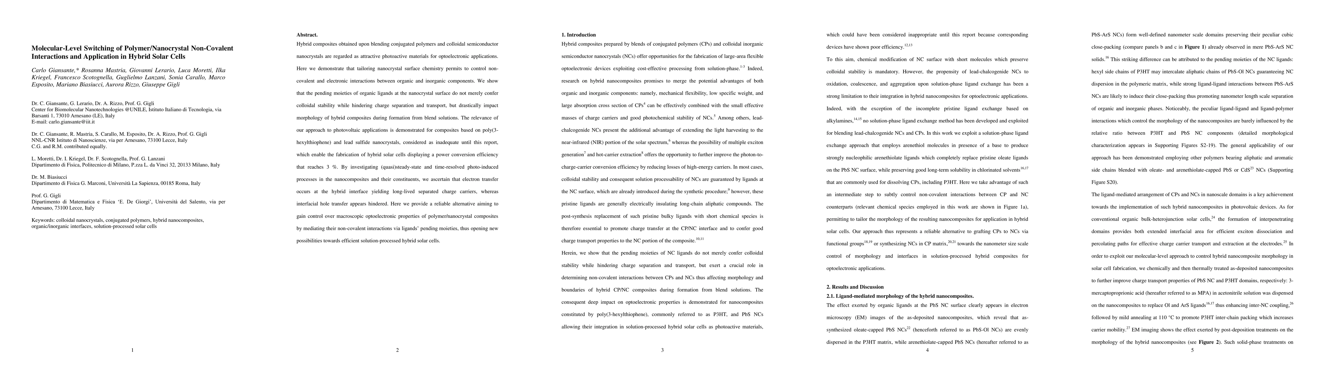 This paper demonstrates that modifying nanocrystal surface chemistry can control non-covalent interactions and electronic interactions in polymer/nanocrystal composites, significantly impacting their morphology and optoelectronic properties. The study shows that these tailored composites, based on poly(3-hexylthiophene) and PbS nanocrystals, can achieve a power conversion efficiency of 3% in hybrid solar cells, highlighting a molecular-level approach to enhance photovoltaic performance.