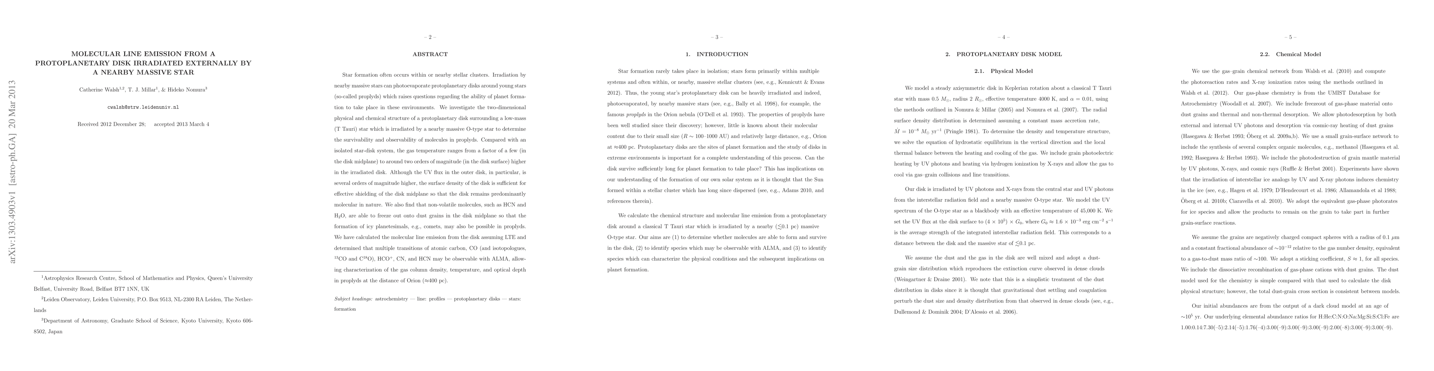This paper investigates the molecular emission from a protoplanetary disk around a T Tauri star irradiated by a nearby massive O-type star, finding that despite high UV flux, the disk remains molecular and potentially supports planet formation. The study predicts observable molecular lines with ALMA, enabling characterization of the disk's physical and chemical properties.