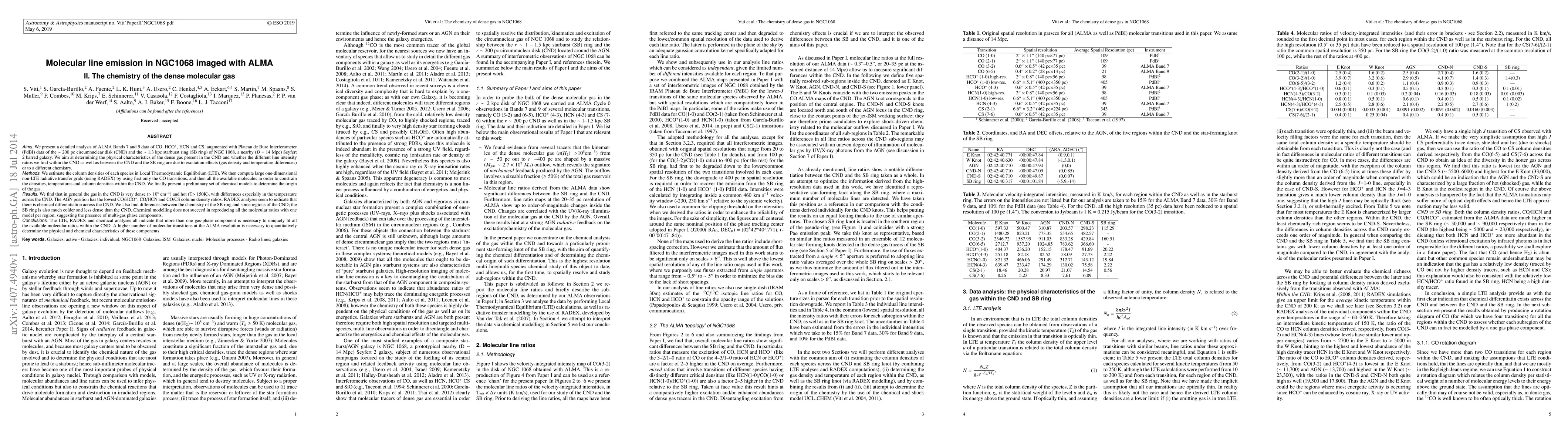 We present a detailed analysis of ALMA Bands 7 and 9 data of CO, HCO+, HCN and CS, augmented with Plateau de Bure Interferometer (PdBI) data of the ~ 200 pc circumnuclear disk (CND) and the ~ 1.3 kpc starburst ring (SB ring) of NGC~1068, a nearby (D = 14 Mpc) Seyfert 2 barred galaxy. We aim at determining the physical characteristics of the dense gas present in the CND and whether the different line intensity ratios we find within the CND as well as between the CND and the SB ring are due to excitation effects (gas density and temperature differences) or to a different chemistry. We estimate the column densities of each species in Local Thermodynamic Equilibrium (LTE). We then compute large one-dimensional non-LTE radiative transfer grids (using RADEX) by using first only the CO transitions, and then all the available molecules in order to constrain the densities, temperatures and column densities within the CND. We finally present a preliminary set of chemical models to determine the origin of the gas. We find that in general the gas in the CND is very dense (> 10^5 cm^-3) and hot (T> 150K), with differences especially in the temperature across the CND. The AGN position has the lowest CO/HCO+, CO/HCN and CO/CS column density ratios. RADEX analyses seem to indicate that there is chemical differentiation across the CND. We also find differences between the chemistry of the SB ring and some regions of the CND; the SB ring is also much colder and less dense than the CND. Chemical modelling does not succeed in reproducing all the molecular ratios with one model per region, suggesting the presence of multi-gas phase components. The LTE, RADEX and chemical analyses all indicate that more than one gas-phase component is necessary to uniquely fit all the available molecular ratios within the CND.