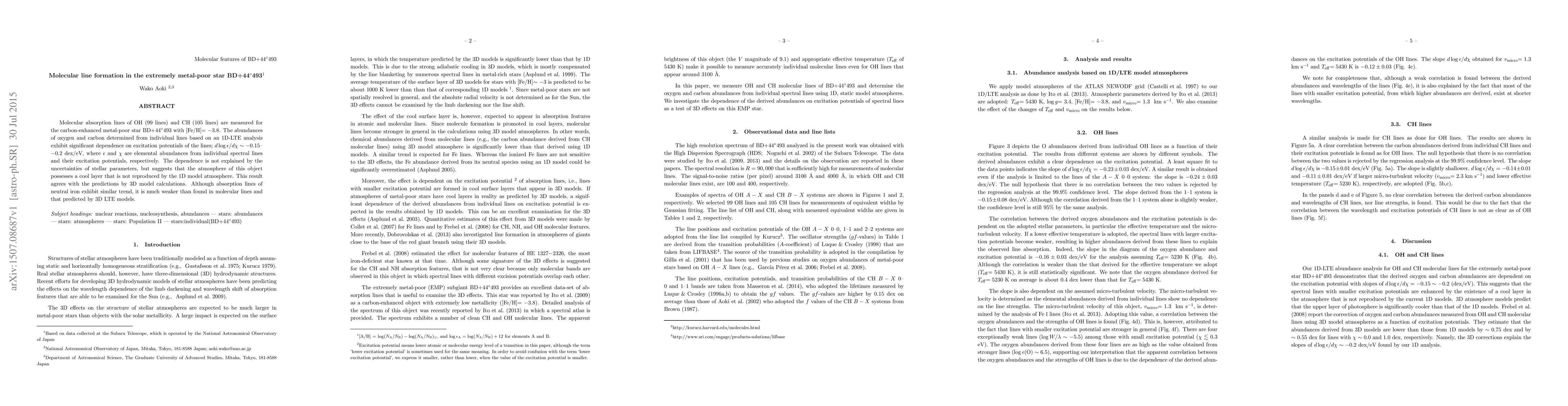 Molecular absorption lines of OH (99 lines) and CH (105 lines) are measured for the carbon-enhanced metal-poor star BD+44 493 with [Fe/H]=-3.8. The abundances of oxygen and carbon determined from individual lines based on an 1D-LTE analysis exhibit significant dependence on excitation potentials of the lines; d log e/d chi ~ -0.15 - -0.2 dex/eV, where e and chi are elemental abundances from individual spectral lines and their excitation potentials, respectively. The dependence is not explained by the uncertainties of stellar parameters, but suggests that the atmosphere of this object possesses a cool layer that is not reproduced by the 1D model atmosphere. This result agrees with the predictions by 3D model calculations. Although absorption lines of neutral iron exhibit similar trend, it is much weaker than found in molecular lines and that predicted by 3D LTE models.