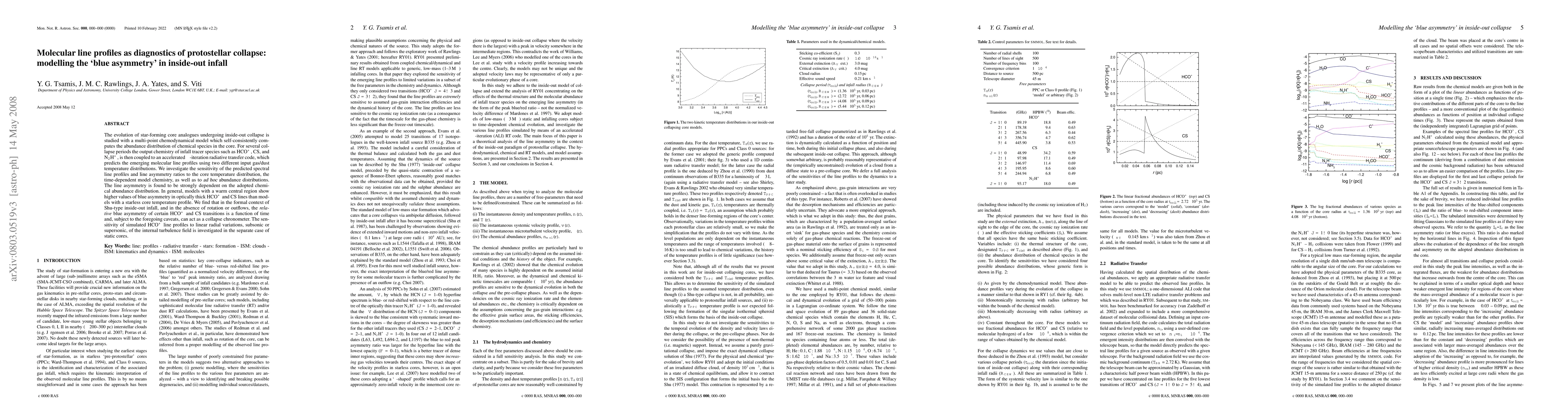 The evolution of star-forming core analogues undergoing inside-out collapse is studied with a multi-point chemodynamical model which self-consistently computes the abundance distribution of chemical species in the core. For several collapse periods the output chemistry of infall tracer species such as HCO+, CS, and N2H+, is then coupled to an accelerated Lambda-iteration radiative transfer code, which predicts the emerging molecular line profiles using two different input gas/dust temperature distributions. We investigate the sensitivity of the predicted spectral line profiles and line asymmetry ratios to the core temperature distribution, the time-dependent model chemistry, as well as to ad hoc abundance distributions. The line asymmetry is found to be strongly dependent on the adopted chemical abundance distribution. In general, models with a warm central region show higher values of blue asymmetry in optically thick HCO+ and CS lines than models with a starless core temperature profile. We find that in the formal context of Shu-type inside-out infall, and in the absence of rotation or outflows, the relative blue asymmetry of certain HCO+ and CS transitions is a function of time and, subject to the foregoing caveats, can act as a collapse chronometer. The sensitivity of simulated HCO+ line profiles to linear radial variations, subsonic or supersonic, of the internal turbulence field is investigated in the separate case of static cores.