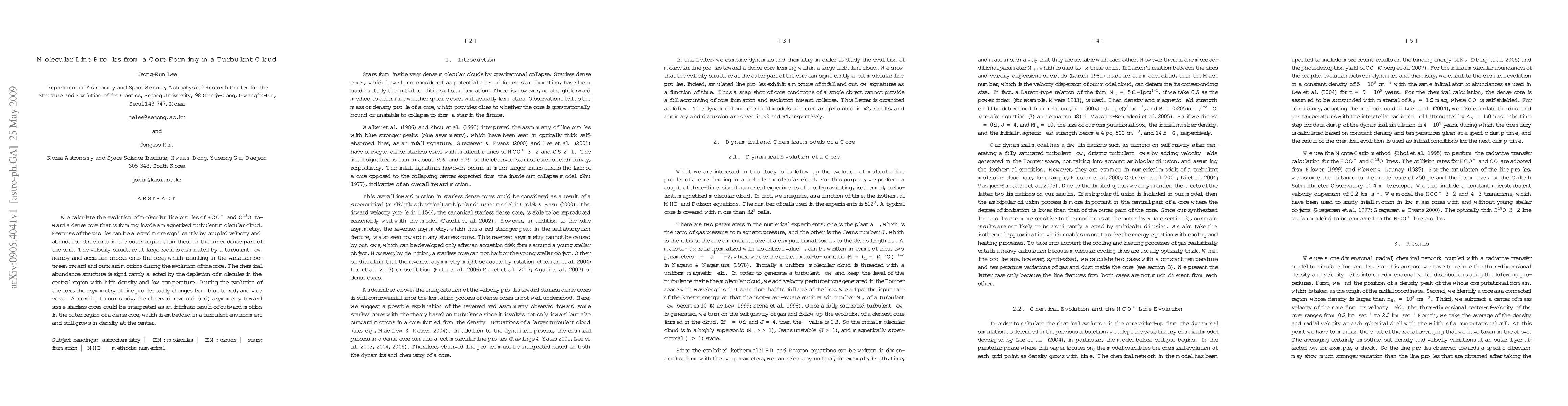 We calculate the evolution of molecular line profiles of HCO$^+$ and C$^{18}$O toward a dense core thatis forming inside a magnetized turbulent molecular cloud. Features of the profiles can be affected more significantly by coupled velocity and abundance structures in the outer region than those in the inner dense part of the core. The velocity structure at large radii is dominated by a turbulent flow nearby and accretion shocks onto the core, which resulting in the variation between inward and outward motions during the evolution of the core. The chemical abundance structure is significantly affected by the depletion of molecules in the central region with high density and low temperature. During the evolution of the core, the asymmetry of line profiles easily changes from blue to red, and vice versa. According to our study, the observed reversed (red) asymmetry toward some starless cores could be interpreted as an intrinsic result of outward motion in the outer region of a dense core, which is embedded in a turbulent environment and still grows in density at the center.