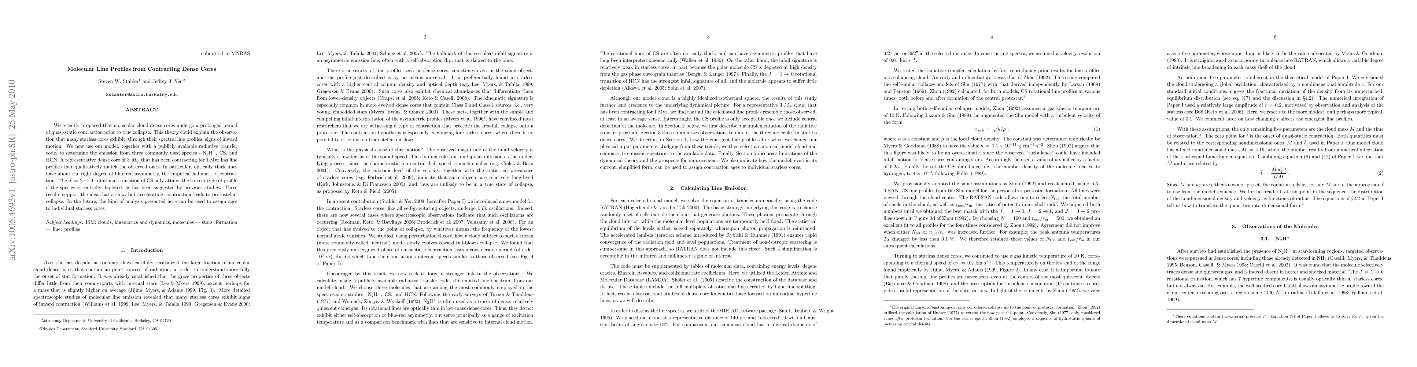 We recently proposed that molecular cloud dense cores undergo a prolonged period of quasi-static contraction prior to true collapse. This theory could explain the observation that many starless cores exhibit, through their spectral line profiles, signs of inward motion. We now use our model, together with a publicly available radiative transfer code, to determine the emission from three commonly used species - N2H+, CS, and HCN. A representative dense core of 3 Msun that has been contracting for 1 Myr has line profiles that qualitatively match the observed ones. In particular, optically thick lines have about the right degree of blue-red asymmetry, the empirical hallmark of contraction. The J=2-1 rotational transition of CS only attains the correct type of profile if the species is centrally depleted, as has been suggested by previous studies. These results support the idea that a slow, but accelerating, contraction leads to protostellar collapse. In the future, the kind of analysis presented here can be used to assign ages to individual starless cores.