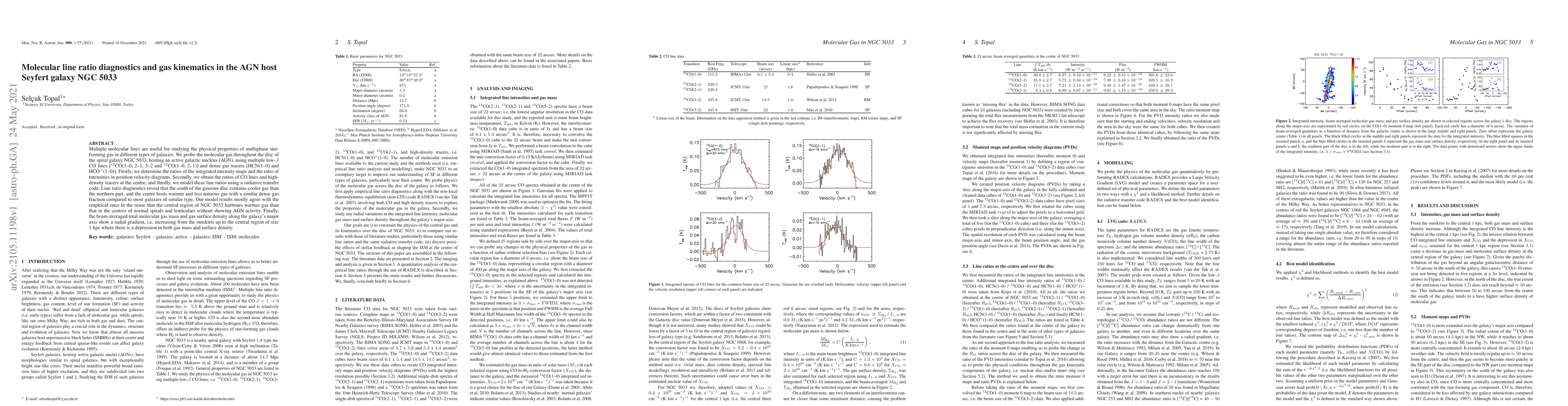 Multiple molecular lines are useful for studying the physical properties of multiphase star-forming gas in different types of galaxies. We probe the molecular gas throughout the disc of the spiral galaxy NGC~5033, hosting an active galactic nucleus (AGN), using multiple low-$J$ CO lines [$^{12}$CO(1-0, 2-1, 3-2 and $^{13}$CO(1-0, 2-1)] and dense gas tracers [HCN(1-0) and HCO$^{+}$(1-0)]. Firstly, we determine the ratios of the integrated intensity maps and the ratio of intensities in position velocity diagrams. Secondly, we obtain the ratios of CO lines and high-density tracers at the centre; and thirdly, we model these line ratios using a radiative transfer code. Line ratio diagnostics reveal that the south of the gaseous disc contains cooler gas than the northern part, and the centre hosts warmer and less tenuous gas with a similar dense gas fraction compared to most galaxies of similar type. Our model results mostly agree with the empirical ones in the sense that the central region of NGC~5033 harbours warmer gas than that in the centres of normal spirals and lenticulars without showing AGN activity. Finally, the beam-averaged total molecular gas mass and gas surface density along the galaxy's major axis show a radial gradient, i.e. increasing from the outskirts up to the central region of size $1$~kpc where there is a depression in both gas mass and surface density.