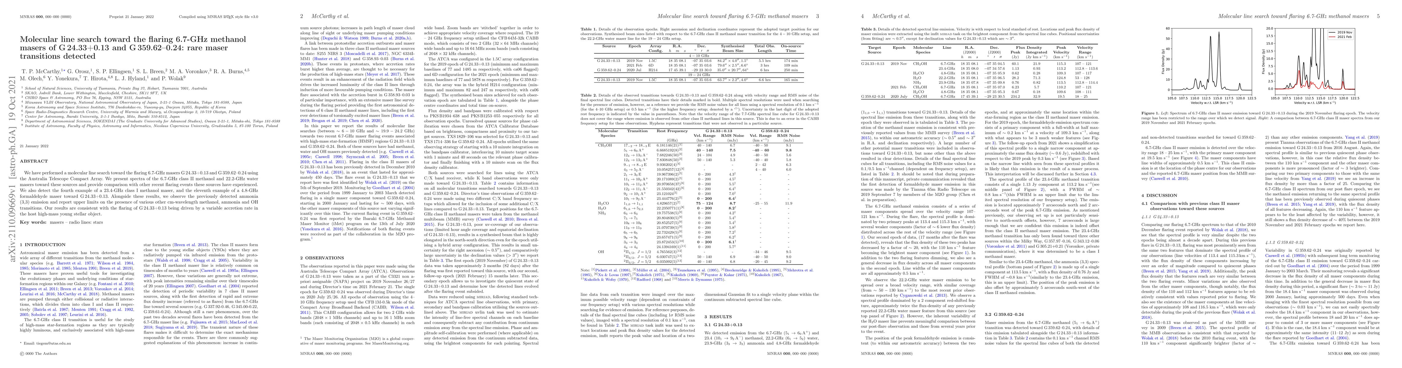 We have performed a molecular line search toward the flaring 6.7-GHz masers G24.33+0.13 and G359.62-0.24 using the Australia Telescope Compact Array. We present spectra of the 6.7-GHz class~II methanol and 22.2-GHz water masers toward these sources and provide comparison with other recent flaring events these sources have experienced. We also detect the fourth example of a 23.4-GHz class~I methanol maser, and the eleventh example of a 4.8-GHz formaldehyde maser toward G24.33+0.13. Alongside these results, we observe the previously detected ammonia (3,3) emission and report upper limits on the presence of various other cm-wavelength methanol, ammonia and OH transitions. Our results are consistent with the flaring of G24.33+0.13 being driven by a variable accretion rate in the host high-mass young stellar object.