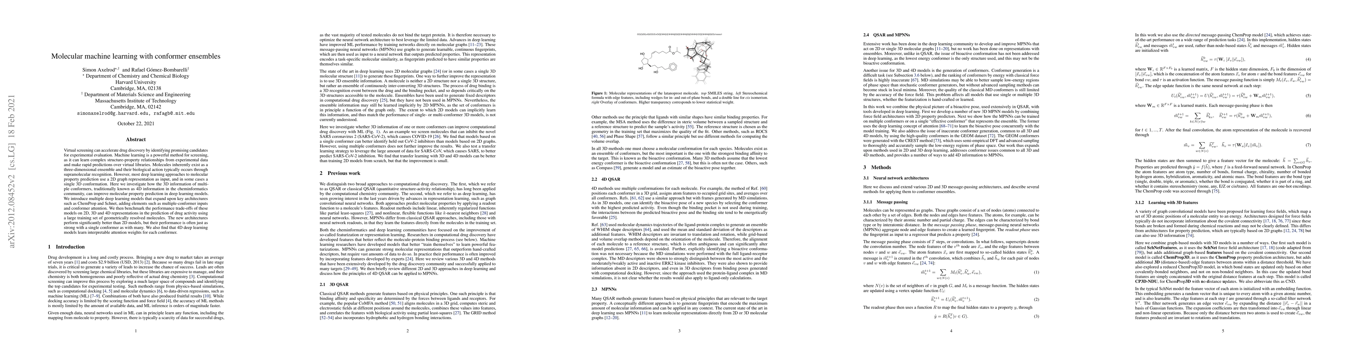 Virtual screening can accelerate drug discovery by identifying promising candidates for experimental evaluation. Machine learning is a powerful method for screening, as it can learn complex structure-property relationships from experimental data and make rapid predictions over virtual libraries. Molecules inherently exist as a three-dimensional ensemble and their biological action typically occurs through supramolecular recognition. However, most deep learning approaches to molecular property prediction use a 2D graph representation as input, and in some cases a single 3D conformation. Here we investigate how the 3D information of multiple conformers, traditionally known as 4D information in the cheminformatics community, can improve molecular property prediction in deep learning models. We introduce multiple deep learning models that expand upon key architectures such as ChemProp and Schnet, adding elements such as multiple-conformer inputs and conformer attention. We then benchmark the performance trade-offs of these models on 2D, 3D and 4D representations in the prediction of drug activity using a large training set of geometrically resolved molecules. The new architectures perform significantly better than 2D models, but their performance is often just as strong with a single conformer as with many. We also find that 4D deep learning models learn interpretable attention weights for each conformer.