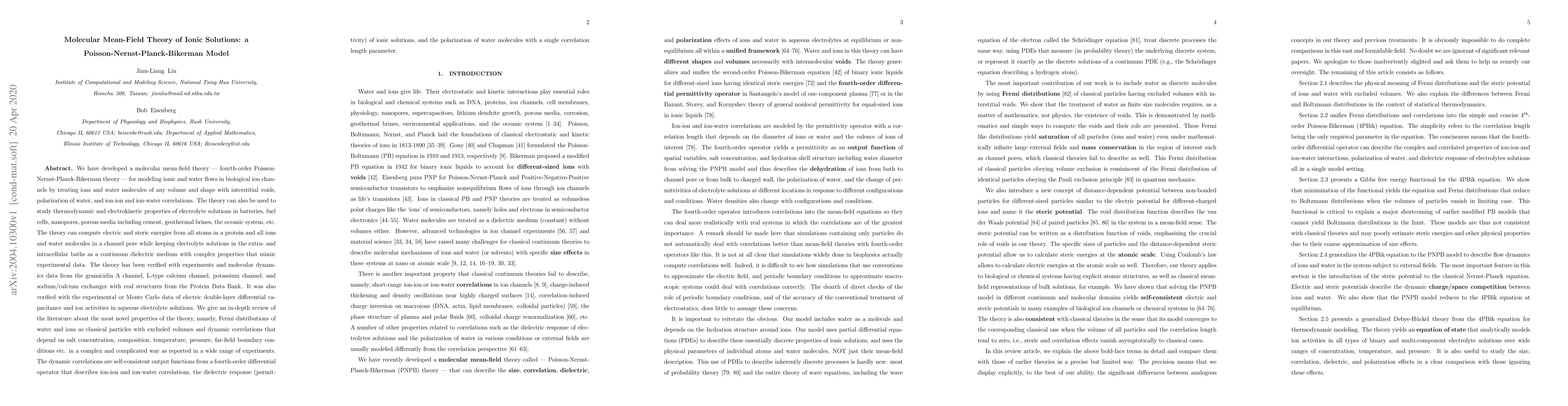 We have developed a molecular mean-field theory -- fourth-order Poisson-Nernst-Planck-Bikerman theory -- for modeling ionic and water flows in biological ion channels by treating ions and water molecules of any volume and shape with interstitial voids, polarization of water, and ion-ion and ion-water correlations. The theory can also be used to study thermodynamic and electrokinetic properties of electrolyte solutions in batteries, fuel cells, nanopores, porous media including cement, geothermal brines, the oceanic system, etc. The theory can compute electric and steric energies from all atoms in a protein and all ions and water molecules in a channel pore while keeping electrolyte solutions in the extra- and intracellular baths as a continuum dielectric medium with complex properties that mimic experimental data. The theory has been verified with experiments and molecular dynamics data from the gramicidin A channel, L-type calcium channel, potassium channel, and sodium/calcium exchanger with real structures from the Protein Data Bank. It was also verified with the experimental or Monte Carlo data of electric double-layer differential capacitance and ion activities in aqueous electrolyte solutions. We give an in-depth review of the literature about the most novel properties of the theory, namely, Fermi distributions of water and ions as classical particles with excluded volumes and dynamic correlations that depend on salt concentration, composition, temperature, pressure, far-field boundary conditions etc. in a complex and complicated way as reported in a wide range of experiments. The dynamic correlations are self-consistent output functions from a fourth-order differential operator that describes ion-ion and ion-water correlations, the dielectric response (permittivity) of ionic solutions, and the polarization of water molecules with a single correlation length parameter.