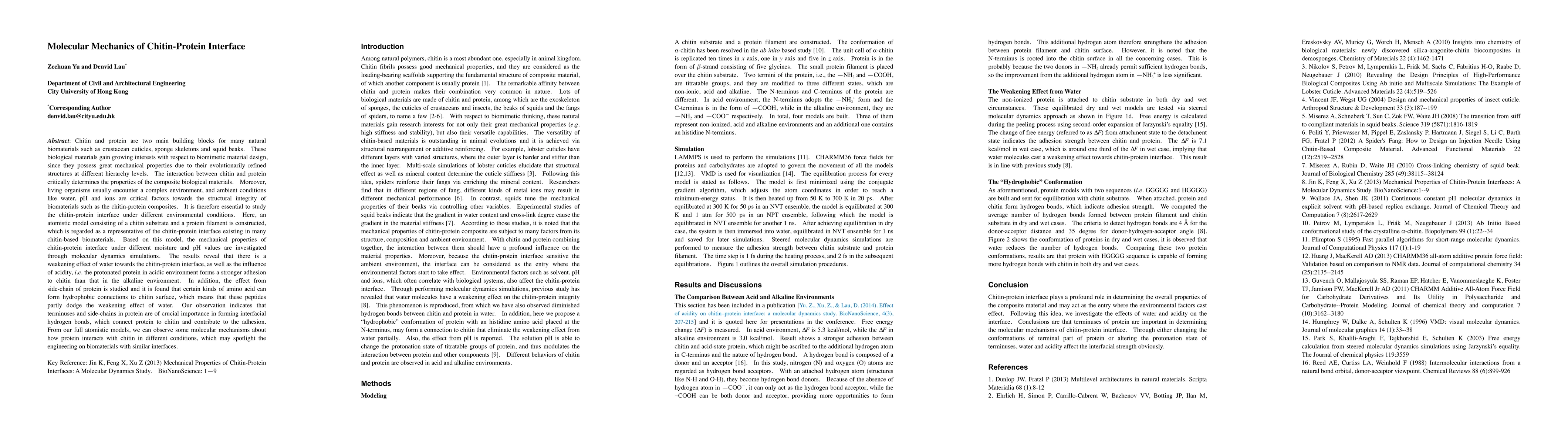 Researchers studied the molecular mechanics of chitin-protein interfaces under different environmental conditions, finding that water weakens the interface but certain amino acids can form hydrophobic connections to strengthen it.