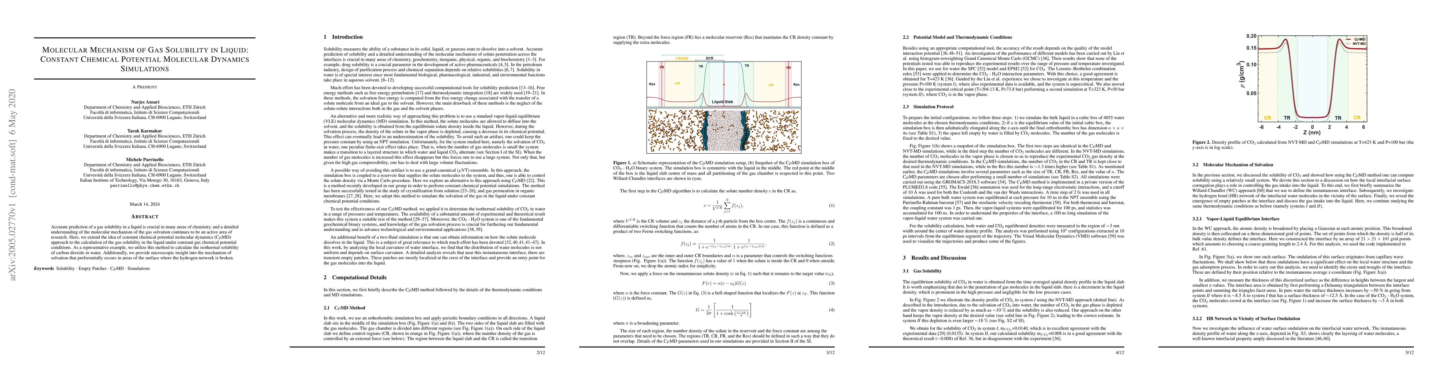 This paper employs constant chemical potential molecular dynamics simulations to predict gas solubility in liquids, specifically calculating carbon dioxide solubility in water. It reveals microscopic insights into solvation mechanisms, highlighting preferential solvation at broken hydrogen network sites.