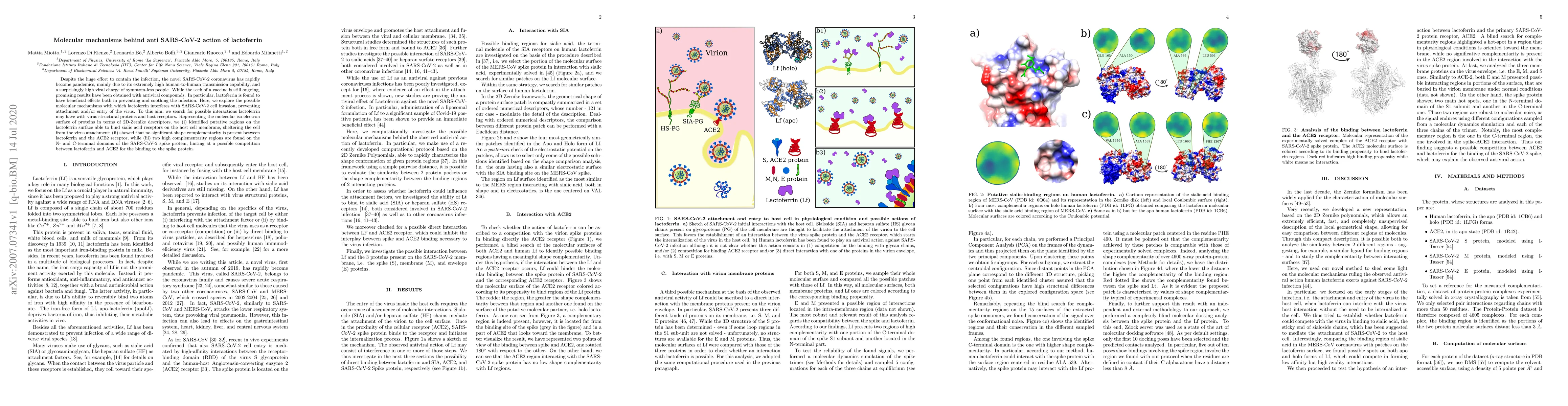 Lactoferrin's anti-SARS-CoV-2 action involves binding to viral proteins and host receptors, preventing virus attachment and entry, while also competing with ACE2 for spike protein binding.