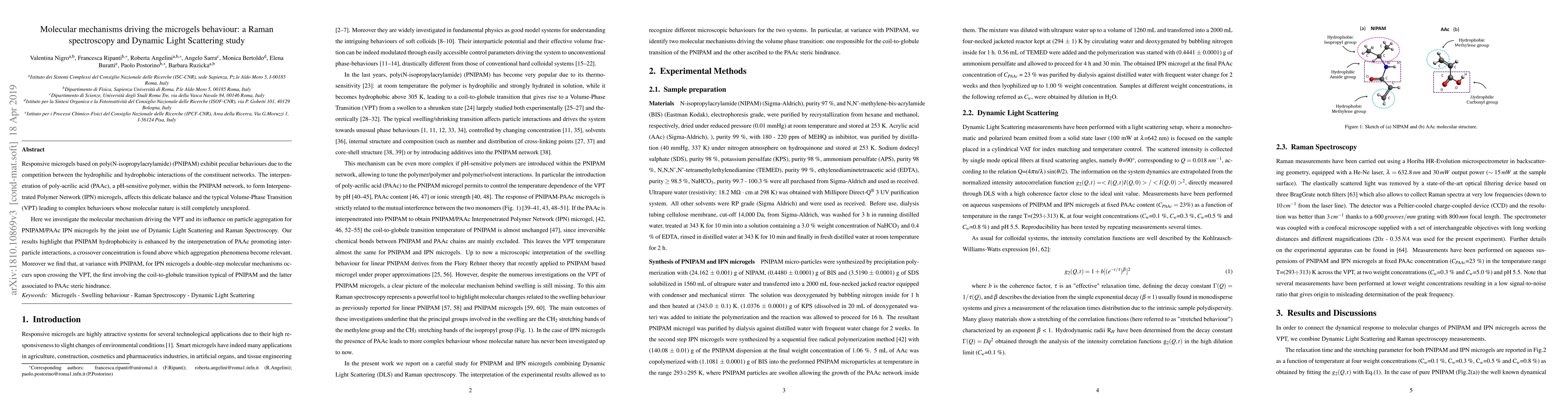 Researchers investigated molecular mechanisms driving microgel behavior in responsive PNIPAM/PAAc IPN microgels using Raman spectroscopy and Dynamic Light Scattering, finding a double-step mechanism involving coil-to-globule transition and steric hindrance.