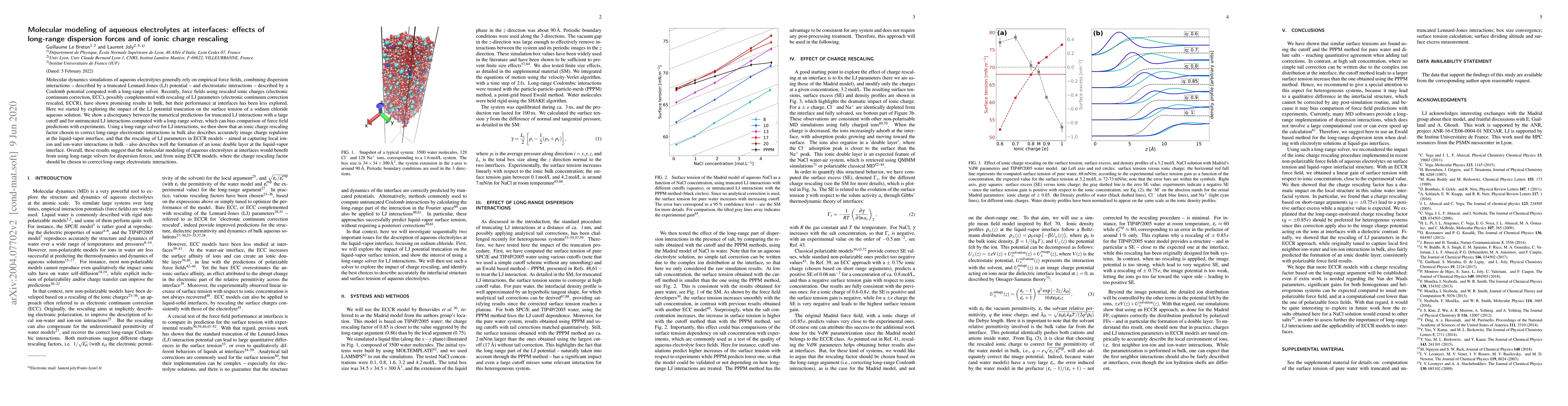 This paper investigates the effects of long-range dispersion forces and ionic charge rescaling on aqueous electrolytes at interfaces via molecular dynamics simulations. It finds that truncation of Lennard-Jones interactions can bias predictions, while using long-range solvers and ECCR models can accurately describe ionic behavior at interfaces.