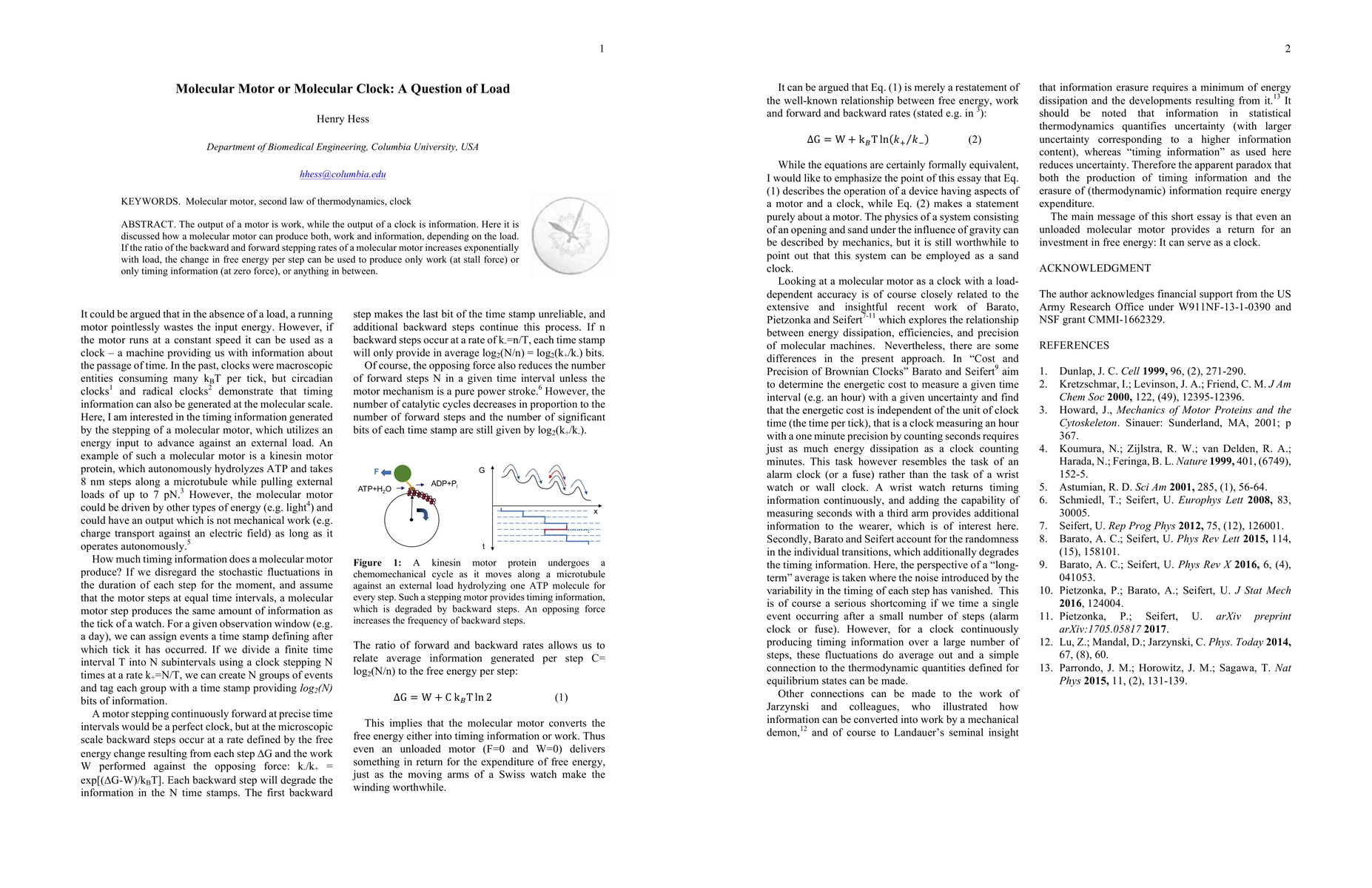 The output of a motor is work, while the output of a clock is information. Here it is discussed how a molecular motor can produce both, work and information, depending on the load. If the ratio of the backward and forward stepping rates of a molecular motor increases exponentially with load, the change in free energy per step can be used to produce only work (at stall force) or only timing information (at zero force), or anything in between.