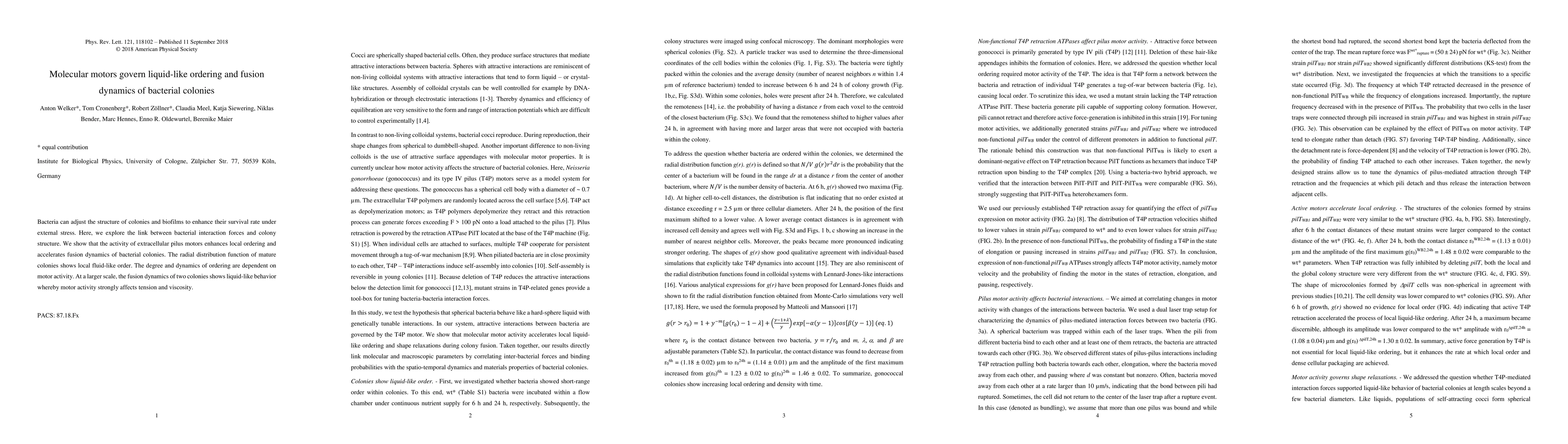 This study reveals that extracellular pilus motors drive local ordering and fusion dynamics in bacterial colonies, leading to liquid-like behavior at a larger scale, with motor activity influencing colony tension and viscosity. The findings underscore the role of molecular motors in shaping bacterial colony structure and response to external stress.