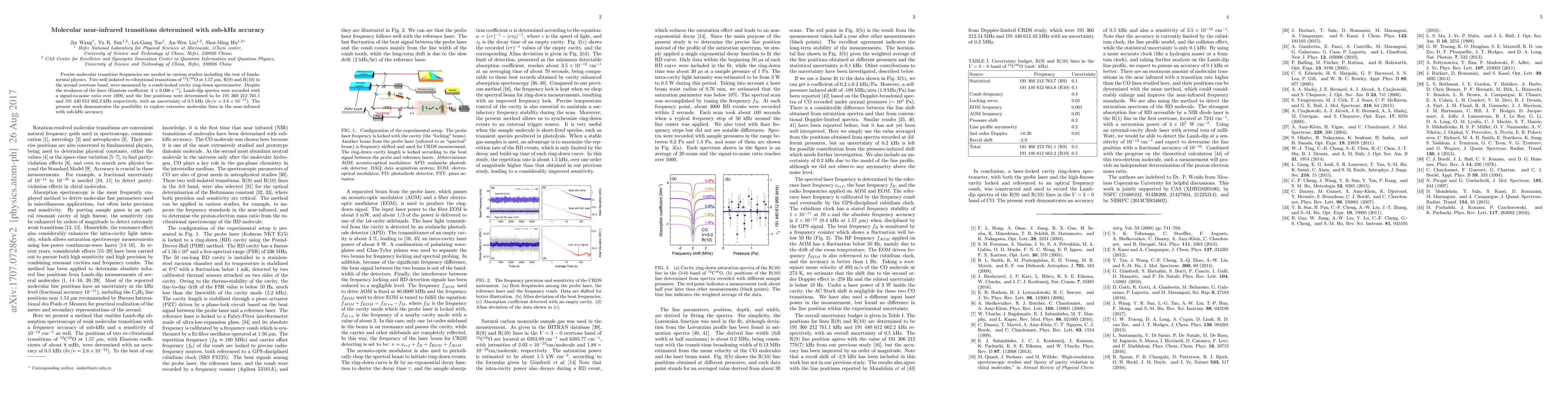 Precise molecular transition frequencies are of great interest in the test of fundamental physics and also in various applications. Two well isolated ro-vibrational transitions of $^{12}$C$^{16}$O at 1.57 $\mu$m, R(9) and R(10) in the second overtone band molecule, were measured by a comb-locked cavity ring-down spectrometer. Despite the weakness of the lines (Einstein coefficient $A\simeq 0.008$ s$^{-1}$), Lamb-dip spectra were recorded with a signal-to-noise ratio over 1000, and the line positions were determined to be 191 360 212 763.7 and 191 440 612 664.8 kHz respectively, with an uncertainty of 0.5 kHz ($\delta\nu/\nu=2.6\times 10^{-12}$). The present work demonstrated the possibility to explore extensive molecular lines in the near-infrared with sub-kHz accuracy.