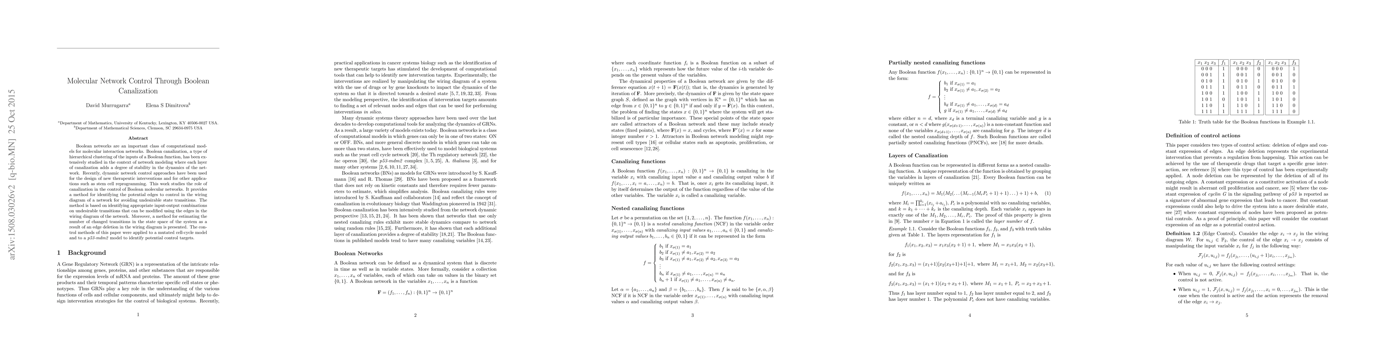 This paper explores the role of Boolean canalization in controlling molecular networks, proposing methods to identify key edges for intervention to avoid undesirable state transitions. It also presents a technique for estimating the impact of edge deletions on network dynamics, demonstrated through applications to cell-cycle and p53-mdm2 models.