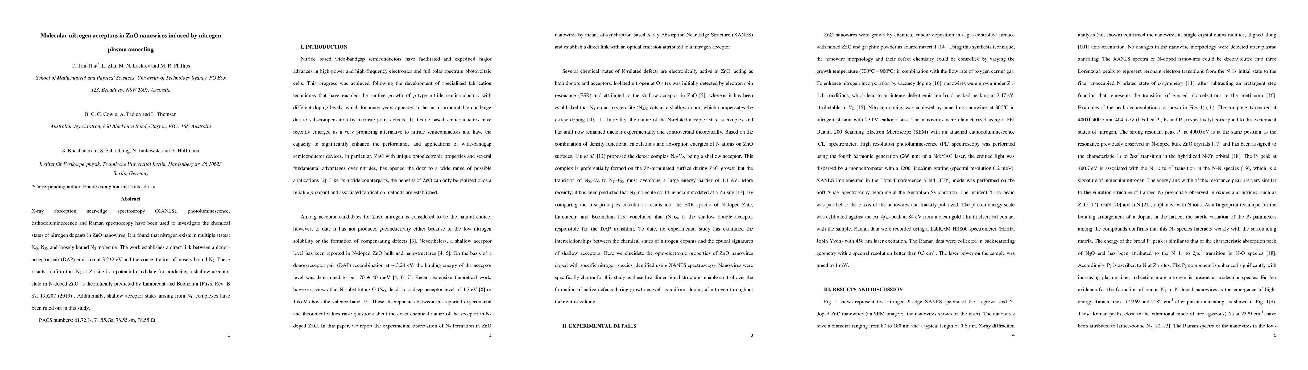 This study investigates nitrogen dopants in ZnO nanowires using various spectroscopic techniques, revealing nitrogen exists in NO, NZn, and loosely bound N2 states. It confirms that N2 at Zn site forms a shallow acceptor state, supporting theoretical predictions.