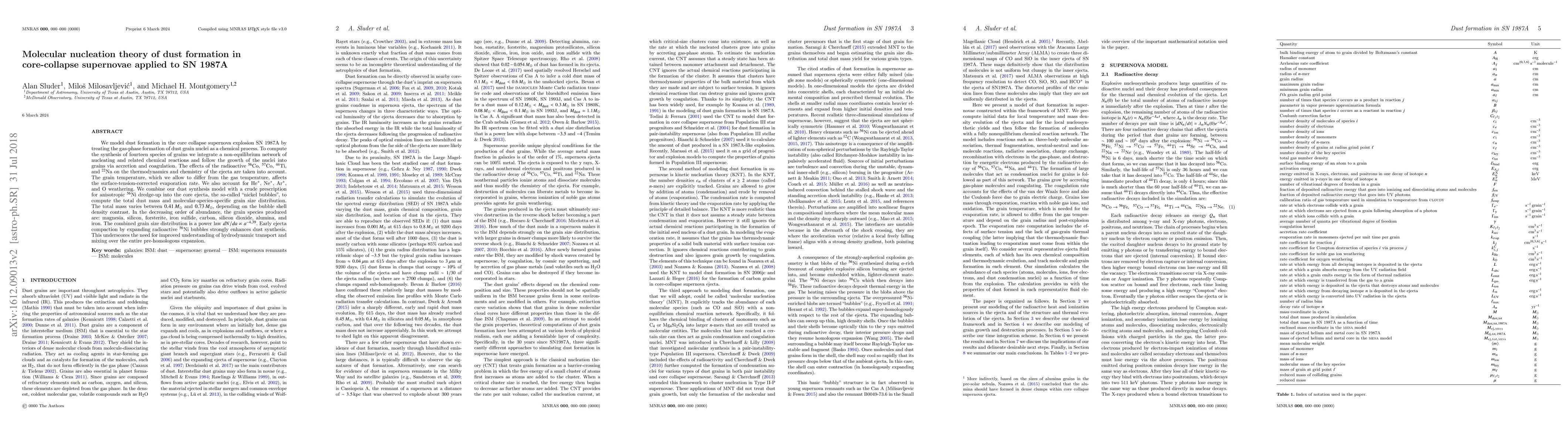 We model dust formation in the core collapse supernova explosion SN 1987A by treating the gas-phase formation of dust grain nuclei as a chemical process. To compute the synthesis of fourteen species of grains we integrate a non-equilibrium network of nucleating and related chemical reactions and follow the growth of the nuclei into grains via accretion and coagulation. The effects of the radioactive cobalt, titanium, and sodium on the thermodynamics and chemistry of the ejecta are taken into account. The grain temperature, which we allow to differ from the gas temperature, affects the surface-tension-corrected evaporation rate. We also account for He$^+$, Ne$^+$, Ar$^+$, and O weathering. We combine our dust synthesis model with a crude prescription for anisotropic radioactive nickel dredge-up into the core ejecta, the so-called `nickel bubbles', to compute the total dust mass and molecular-species-specific grain size distribution. The total mass varies between $0.41\,M_\odot$ and $0.73\,M_\odot$, depending on the bubble shell density contrast. In the decreasing order of abundance, the grain species produced are: magnesia, silicon, forsterite, iron sulfide, carbon, silicon dioxide, alumina, and iron. The combined grain size distribution is a power law $dN/da\propto a^{-4.39}$. Early ejecta compaction by expanding radioactive nickel bubbles strongly enhances dust synthesis. This underscores the need for improved understanding of hydrodynamic transport and mixing over the entire pre-homologous expansion.