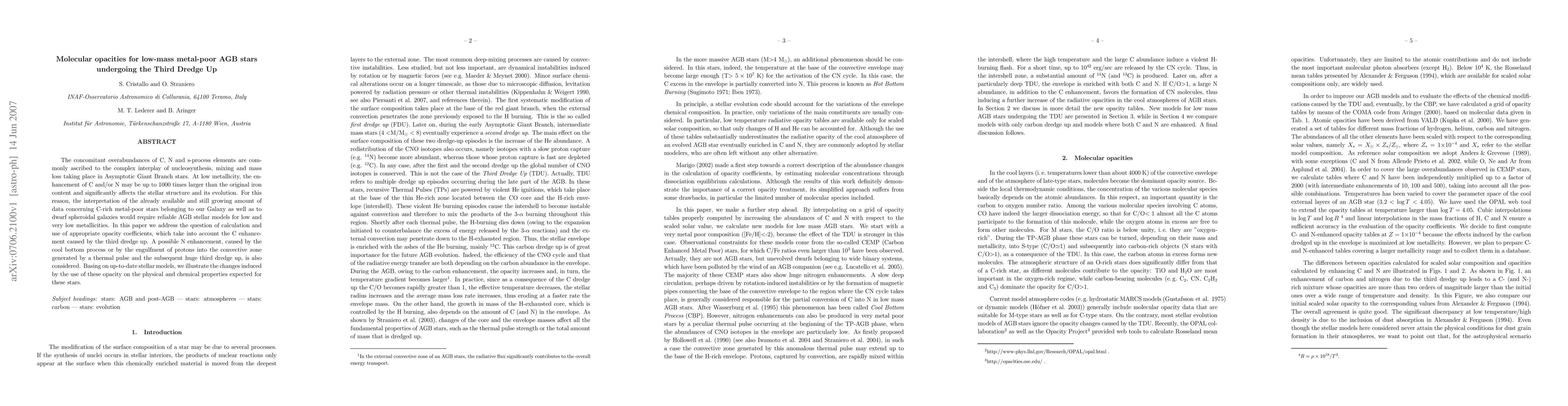 This paper investigates molecular opacities for low-mass metal-poor Asymptotic Giant Branch (AGB) stars undergoing the third dredge up, focusing on the significant enhancement of C and N elements. It provides updated opacity coefficients that account for these enhancements, illustrating their impact on the stars' physical and chemical properties.