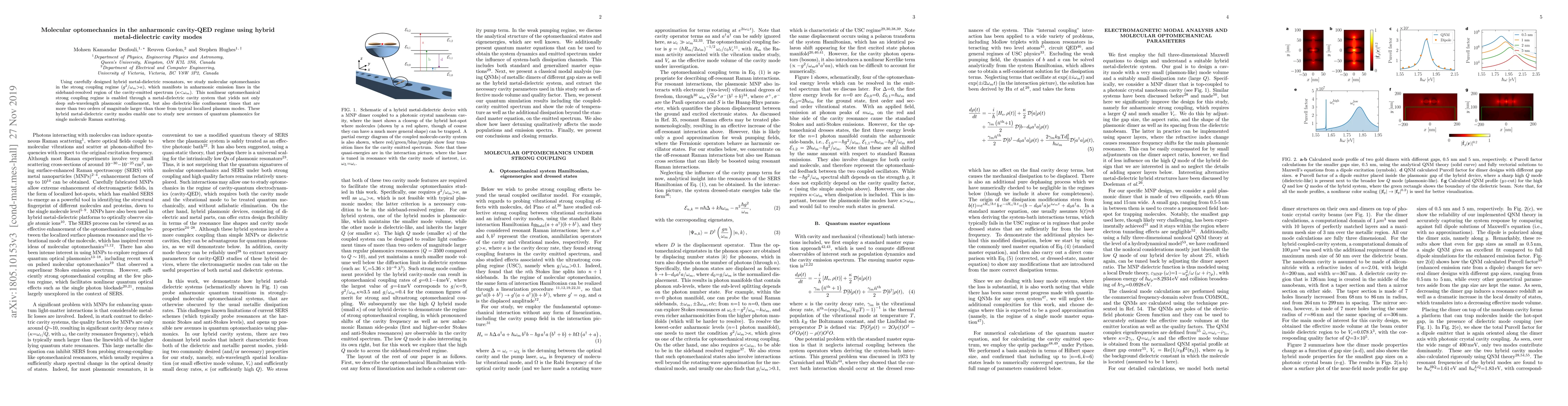 This paper investigates molecular optomechanics in the anharmonic cavity-QED regime using hybrid metal-dielectric resonators, revealing strong coupling and nonlinear effects in the cavity-emitted spectrum. The hybrid system provides deep sub-wavelength plasmonic confinement with significantly longer dielectric-like confinement times, enabling new quantum plasmonic studies for single molecule Raman scattering.