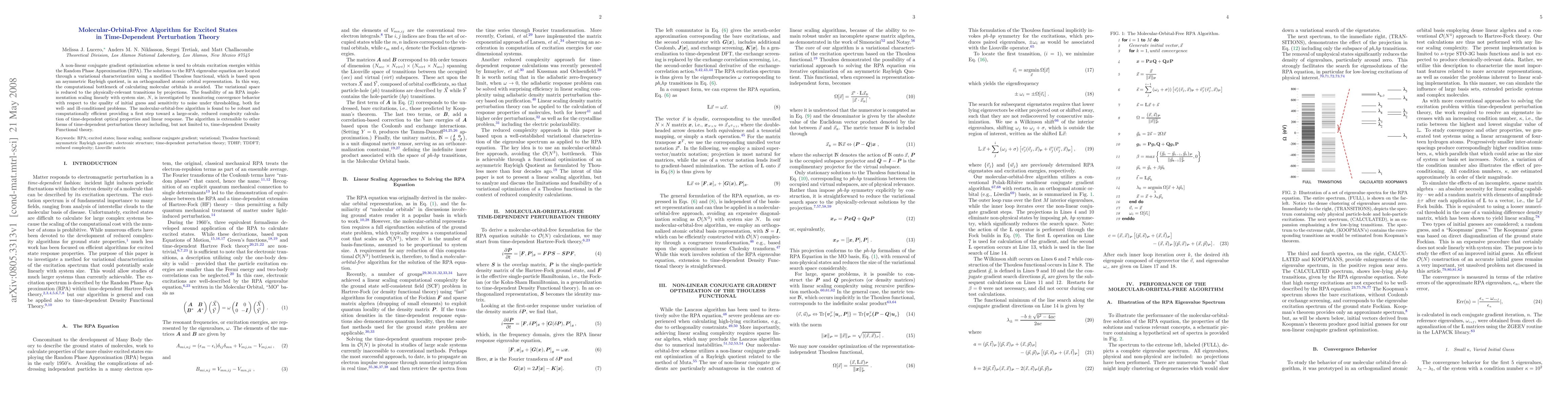 This paper presents a molecular-orbital-free algorithm for calculating excited states using Random Phase Approximation (RPA) in time-dependent perturbation theory, employing a non-linear conjugate gradient optimization scheme. The method avoids the computational bottleneck of molecular orbital calculations and shows promising scalability and robustness for large-scale optical property calculations.