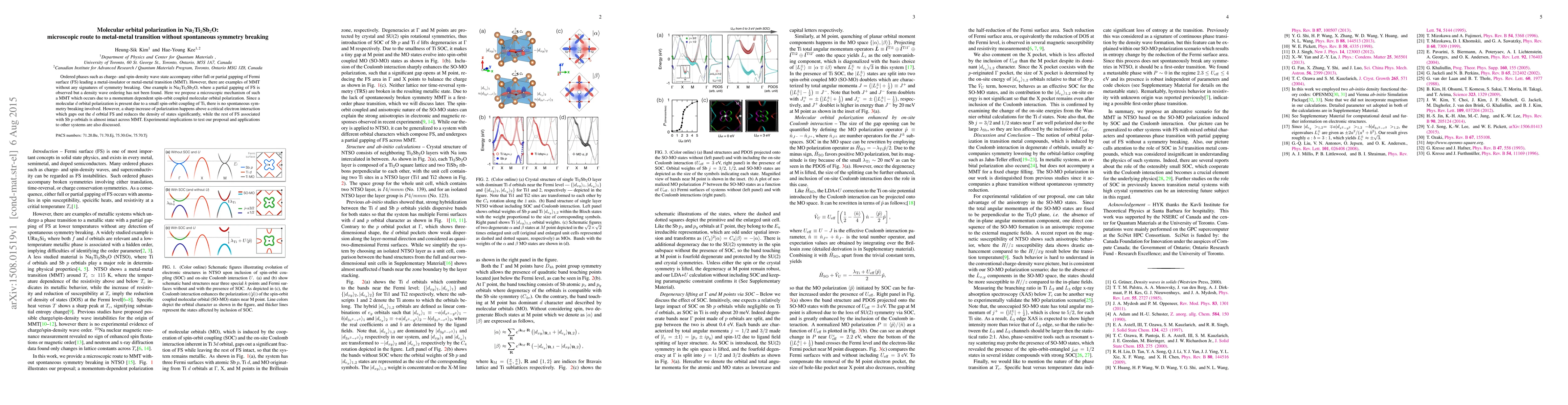 This paper proposes a microscopic mechanism for a metal-metal transition in Na$_2$Ti$_2$Sb$_2$O without symmetry breaking, driven by spin-orbit coupled molecular orbital polarization. The transition occurs via a partial gapping of the Fermi surface without density wave ordering, highlighting the role of electron interactions in the process.