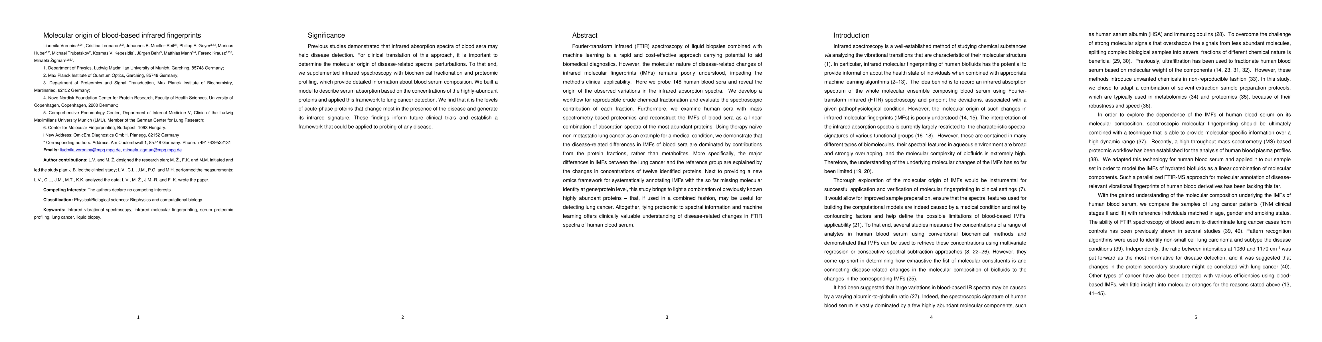 Previous studies demonstrated that infrared absorption spectra of blood sera may help disease detection. For clinical translation of this approach, it is important to determine the molecular origin of disease-related spectral perturbations. To that end, we supplemented infrared spectroscopy with biochemical fractionation and proteomic profiling, which provide detailed information about blood serum composition. We built a model to describe serum absorption based on the concentrations of the highly-abundant proteins and applied this framework to lung cancer detection. We find that it is the levels of acute-phase proteins that change most in the presence of the disease and generate its infrared signature. These findings inform future clinical trials and establish a framework that could be applied to probing of any disease.