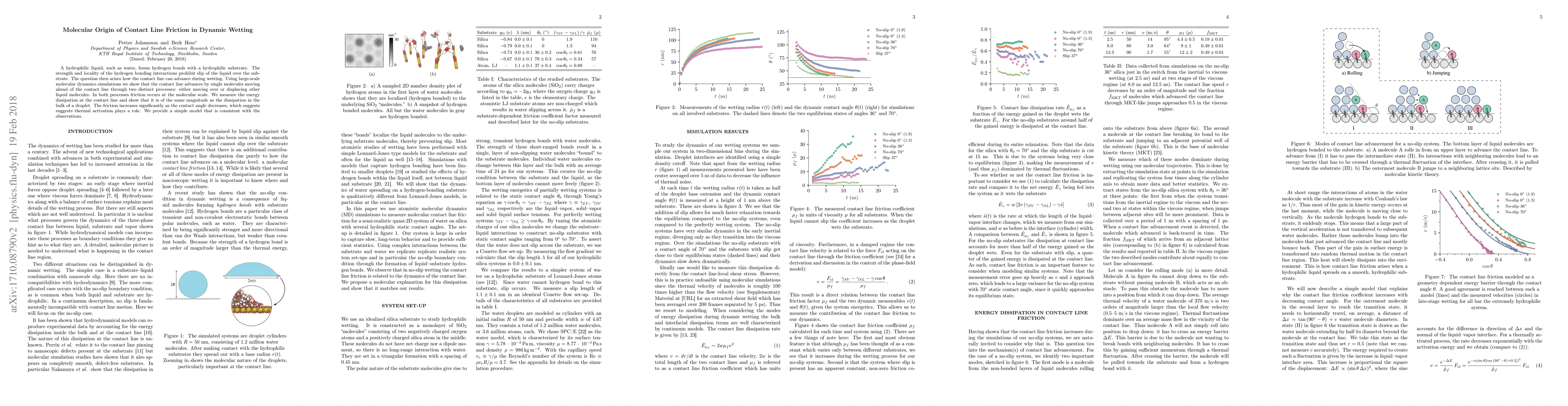Molecular dynamics simulations reveal that contact line friction in dynamic wetting arises from hydrogen bond interactions that prohibit liquid slip, leading to molecular-scale friction during the advancement of the contact line via single molecule movement or displacement. Energy dissipation at the contact line matches that in the bulk, with friction increasing as the contact angle decreases, indicating thermal activation.