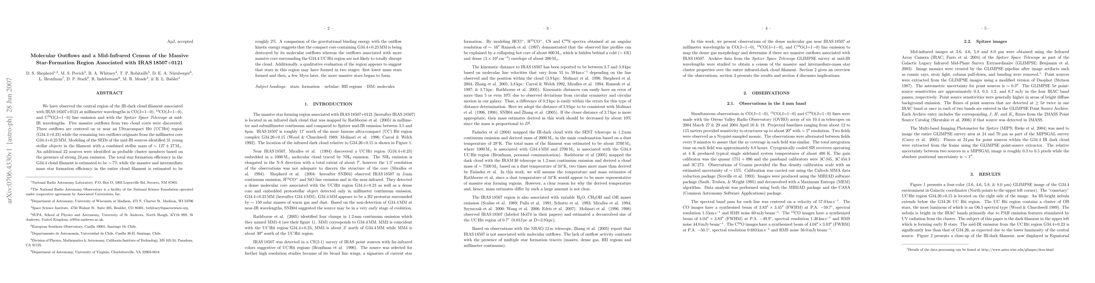 The study observed IRAS 18507+0121 using millimeter wavelengths and Spitzer Space Telescope, discovering five massive outflows from two cloud cores. It identified 31 young stellar objects and estimated the star formation efficiency to be ~7% in the G34.4 cloud filament. The findings suggest a two-stage star formation process, with lower mass stars forming first followed by more massive stars, and indicate that outflows are disrupting less massive cores but not more massive ones.