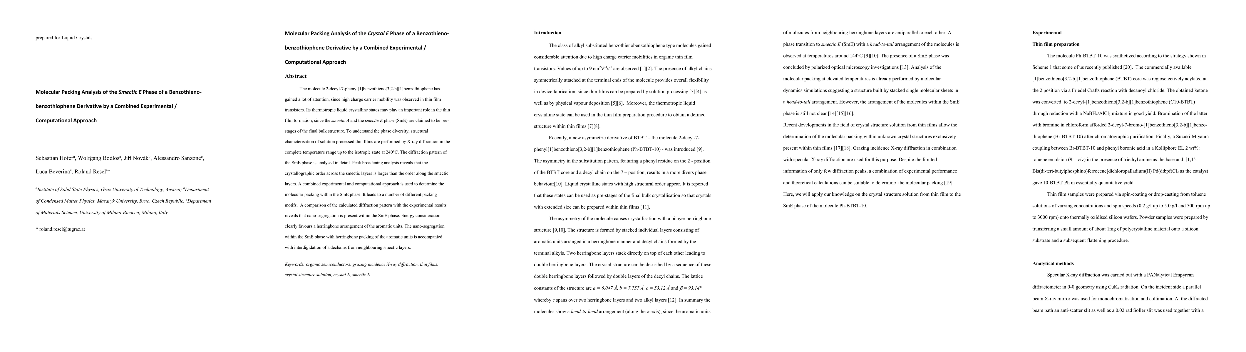 The molecule 2-decyl-7-phenyl[1]benzothieno[3,2-b][1]benzothiophene has gained a lot of attention, since high charge carrier mobility was observed in thin film transistors. Its thermotropic liquid crystalline states may play an important role in the thin film formation, since the smectic A and the smectic E phase (SmE) are claimed to be pre-stages of the final bulk structure. To understand the phase diversity, structural characterisation of solution processed thin films are performed by X-ray diffraction in the complete temperature range up to the isotropic state at 240{\deg}C. The diffraction pattern of the SmE phase is analysed in detail. Peak broadening analysis reveals that the crystallographic order across the smectic layers is larger than the order along the smectic layers. A combined experimental and computational approach is used to determine the molecular packing within the SmE phase. It leads to a number of different packing motifs. A comparison of the calculated diffraction pattern with the experimental results reveals that nano-segregation is present within the SmE phase. Energy consideration clearly favours a herringbone arrangement of the aromatic units. The nano-segregation within the SmE phase with herringbone packing of the aromatic units is accompanied with interdigidation of sidechains from neighbouring smectic layers.
