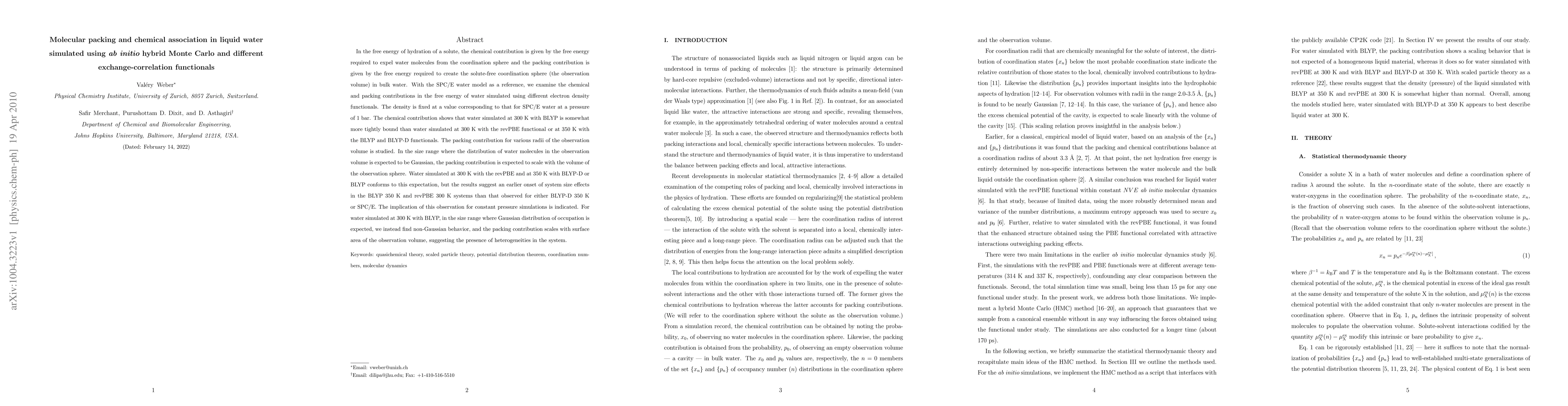 In the free energy of hydration of a solute, the chemical contribution is given by the free energy required to expel water molecules from the coordination sphere and the packing contribution is given by the free energy required to create the solute-free coordination sphere (the observation volume) in bulk water. With the SPC/E water model as a reference, we examine the chemical and packing contributions in the free energy of water simulated using different electron density functionals. The density is fixed at a value corresponding to that for SPC/E water at a pressure of 1 bar. The chemical contribution shows that water simulated at 300 K with BLYP is somewhat more tightly bound than water simulated at 300 K with the revPBE functional or at 350 K with the BLYP and BLYP-D functionals. The packing contribution for various radii of the observation volume is studied. In the size range where the distribution of water molecules in the observation volume is expected to be Gaussian, the packing contribution is expected to scale with the volume of the observation sphere. Water simulated at 300 K with the revPBE and at 350 K with BLYP-D or BLYP conforms to this expectation, but the results suggest an earlier onset of system size effects in the BLYP 350 K and revPBE 300 K systems than that observed for either BLYP-D 350 K or SPC/E. The implication of this observation for constant pressure simulations is indicated. For water simulated at 300 K with BLYP, in the size range where Gaussian distribution of occupation is expected, we instead find non-Gaussian behavior, and the packing contribution scales with surface area of the observation volume, suggesting the presence of heterogeneities in the system.