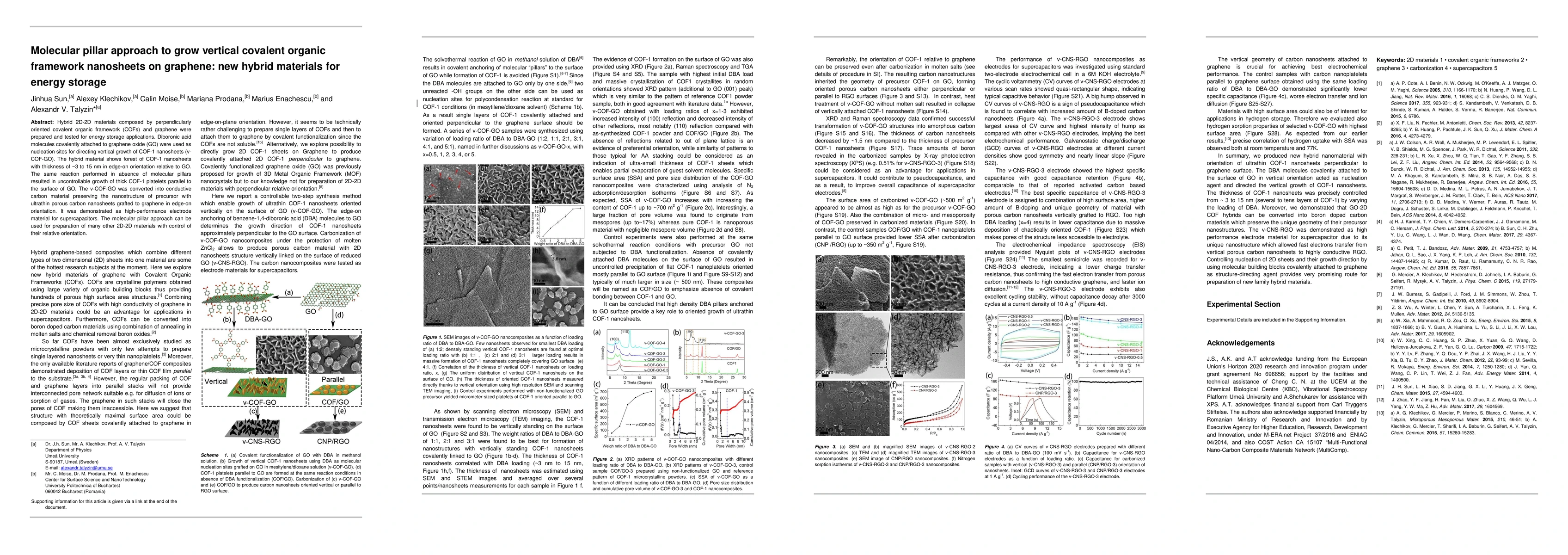 This research develops a molecular pillar approach to grow vertical covalent organic framework nanosheets on graphene, creating a new hybrid material for energy storage. The method results in ultrathin, edge-on oriented COF nanosheets on graphene, which, when converted to carbon, serve as high-performance supercapacitor electrodes.
