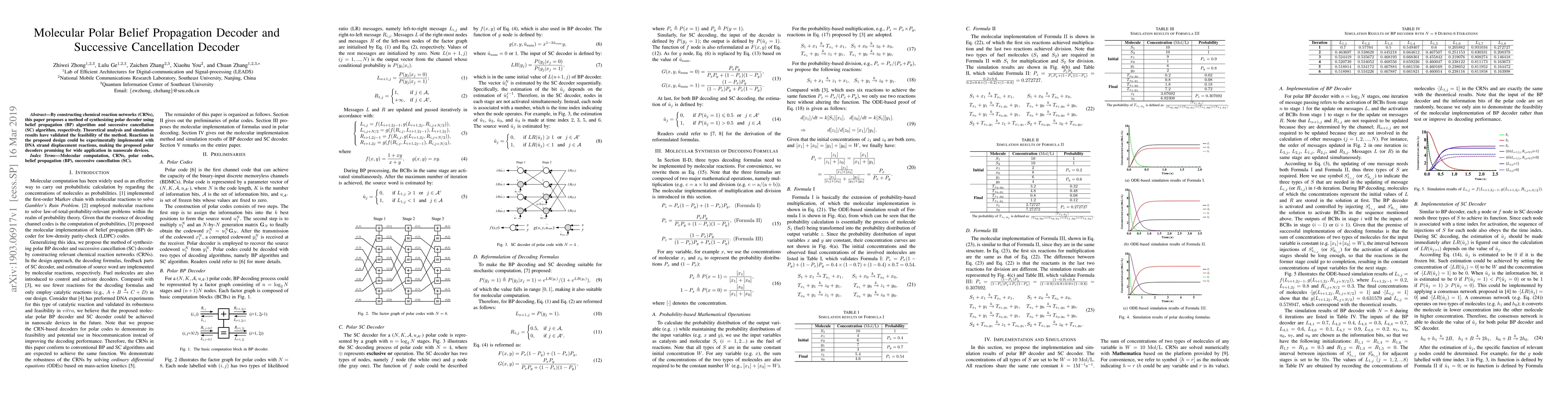 This paper proposes molecular polar decoders using chemical reaction networks (CRNs) based on belief propagation and successive cancellation algorithms, validated by theoretical and simulation results. The implementation via DNA strand displacement reactions suggests potential for nanoscale devices.