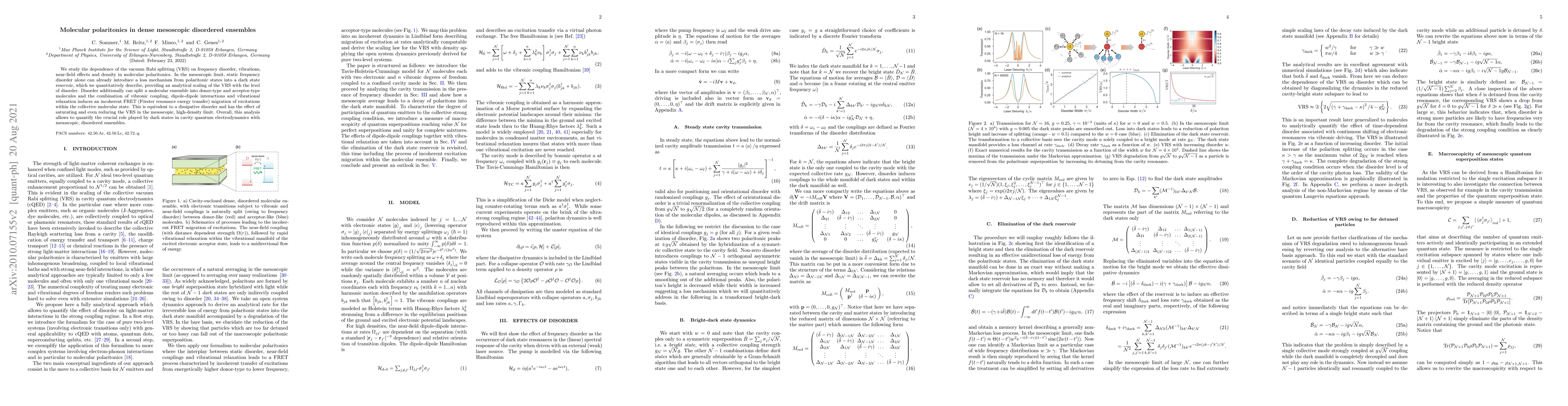 We study the dependence of the vacuum Rabi splitting (VRS) on frequency disorder, vibrations, near-field effects and density in molecular polaritonics. In the mesoscopic limit, static frequency disorder alone can already introduce a loss mechanism from polaritonic states into a dark state reservoir, which we quantitatively describe, providing an analytical scaling of the VRS with the level of disorder. Disorder additionally can split a molecular ensemble into donor-type and acceptor-type molecules and the combination of vibronic coupling, dipole-dipole interactions and vibrational relaxation induces an incoherent FRET (F\"{o}rster resonance energy transfer) migration of excitations within the collective molecular state. This is equivalent to a dissipative disorder and has the effect of saturating and even reducing the VRS in the mesoscopic, high-density limit. Overall, this analysis allows to quantify the crucial role played by dark states in cavity quantum electrodynamics with mesoscopic, disordered ensembles.