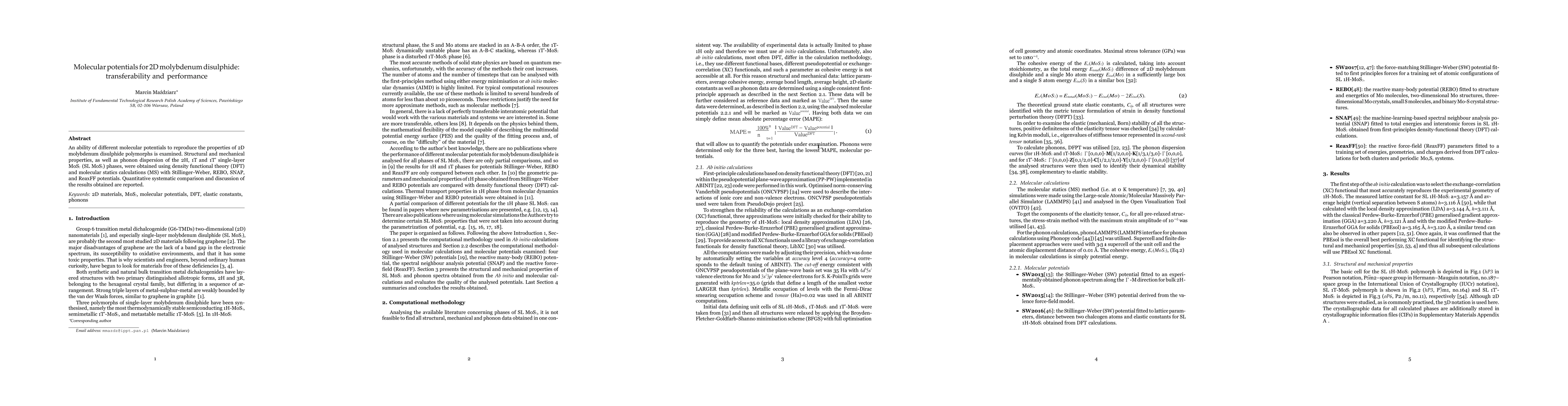 This study evaluates the effectiveness of various molecular potentials in accurately reproducing the structural, mechanical, and phonon properties of different phases of 2D molybdenum disulphide using DFT and MS calculations. The comparative analysis highlights the transferability and performance of Stillinger-Weber, REBO, SNAP, and ReaxFF potentials.