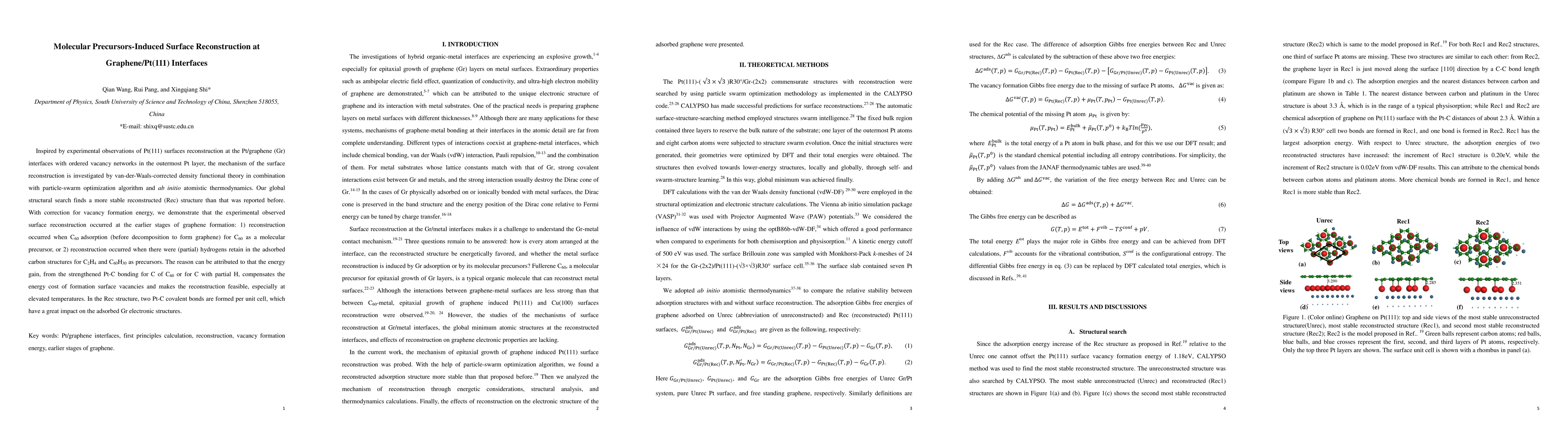 The study investigates the mechanism of surface reconstruction at Graphene/Pt(111) interfaces using van-der-Waals-corrected density functional theory combined with particle-swarm optimization algorithm and ab initio atomistic thermodynamics.