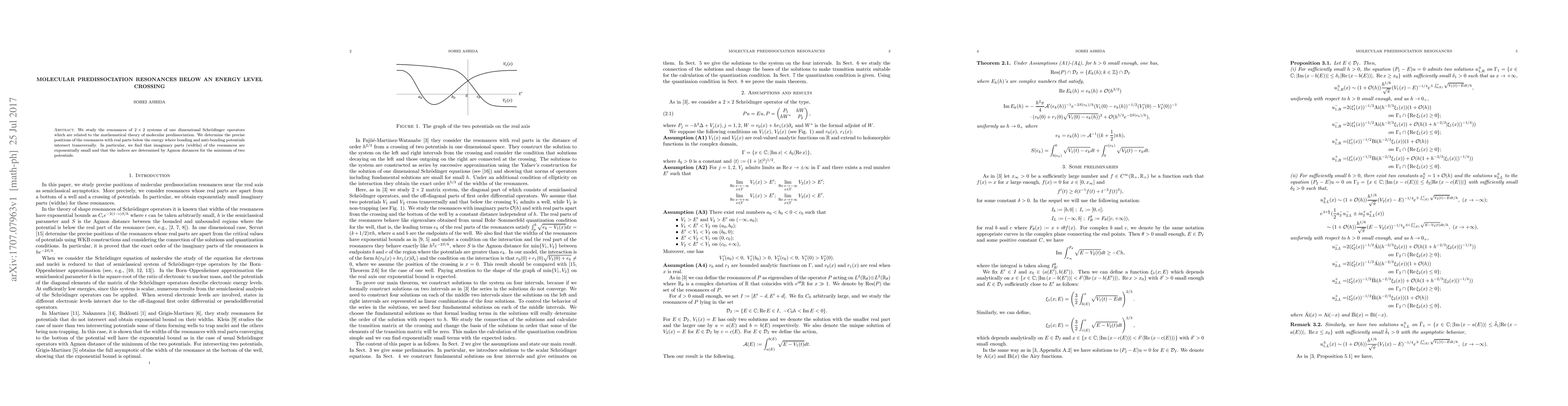 Researchers studied molecular predissociation resonances in 1D systems, finding that imaginary parts of resonances are exponentially small and determined by Agmon distances at the intersection of bonding and anti-bonding potentials.