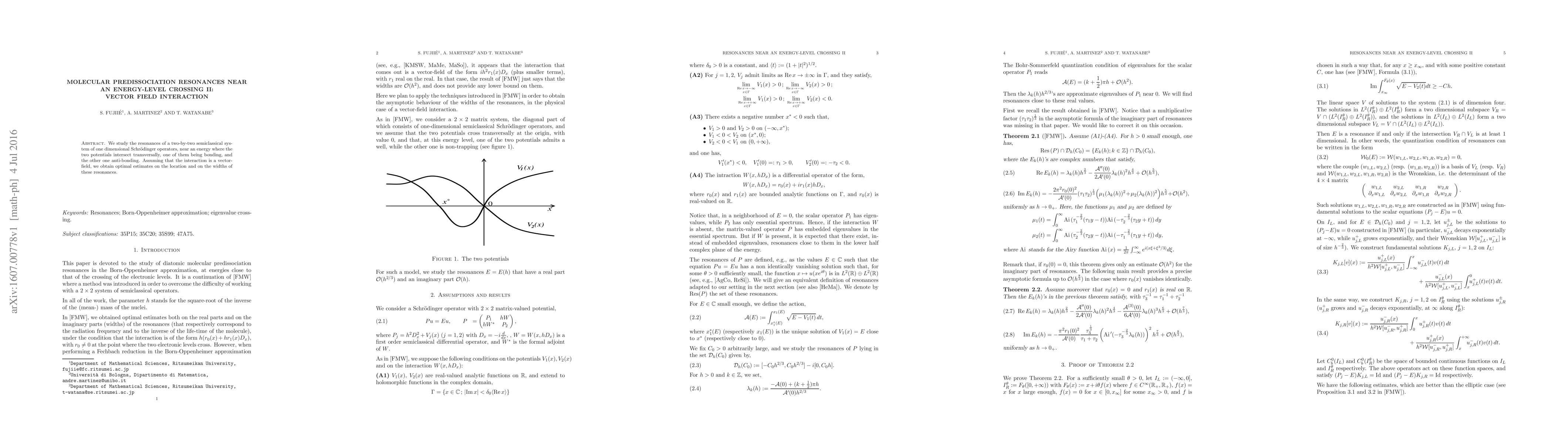 Researchers studied resonances near an energy-level crossing in a two-dimensional system with intersecting potentials, finding optimal estimates on resonance location and widths using vector field interaction.