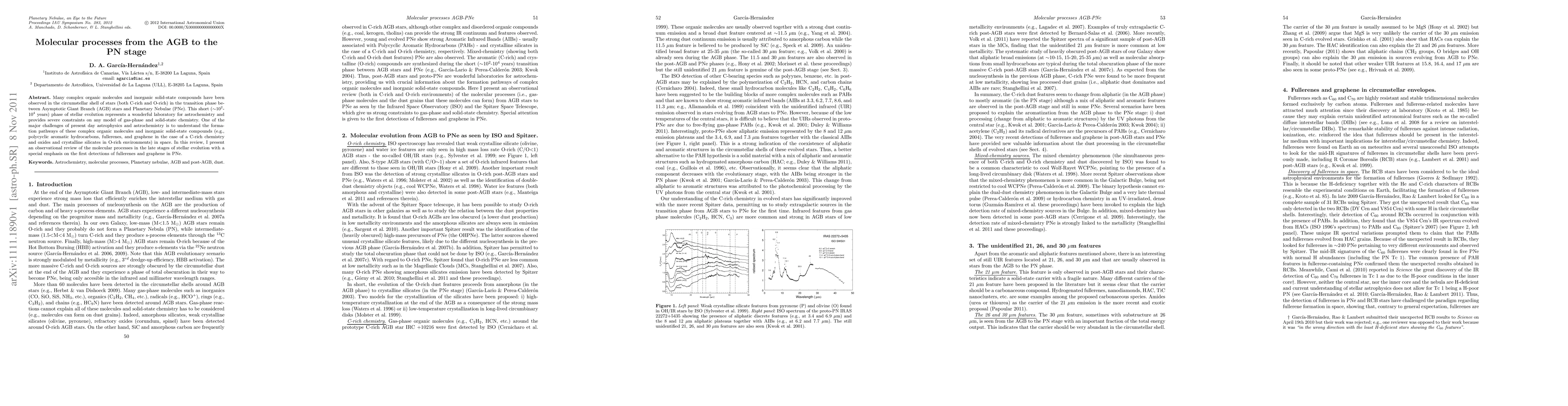 Many complex organic molecules and inorganic solid-state compounds have been observed in the circumstellar shell of stars (both C-rich and O-rich) in the transition phase between Asymptotic Giant Branch (AGB) stars and Planetary Nebulae (PNe). This short (~100-10.000 years) phase of stellar evolution represents a wonderful laboratory for astrochemistry and provides severe constraints on any model of gas-phase and solid-state chemistry. One of the major challenges of present day astrophysics and astrochemistry is to understand the formation pathways of these complex organic molecules and inorganic solid-state compounds (e.g., polycyclic aromatic hydrocarbons, fullerenes, and graphene in the case of a C-rich chemistry and oxides and crystalline silicates in O-rich environments) in space. In this review, I present an observational review of the molecular processes in the late stages of stellar evolution with a special emphasis on the first detections of fullerenes and graphene in PNe.