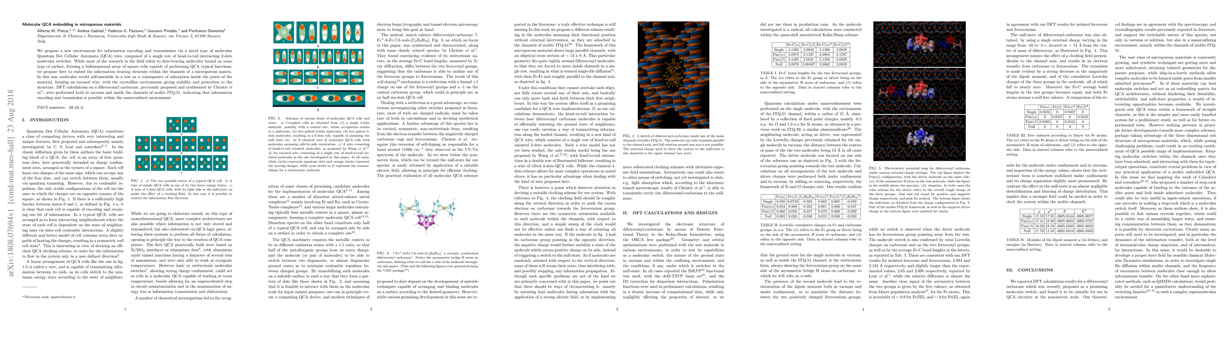 We propose a new environment for information encoding and transmission via a novel type of molecular Quantum Dot Cellular Automata (QCA) wire, composed of a single row of head-to-tail interacting 2-dots molecular switches. While most of the research in the field refers to dots-bearing molecules bound on some type of surface, forming a bidimensional array of square cells capable of performing QCA typical functions, we propose here to embed the information bearing elements within the channels of a microporous matrix. In this way molecules would self-assemble in a row as a consequence of adsorption inside the pores of the material, forming an encased wire, with the crystalline environment giving stability and protection to the structure. DFT calculations on a diferrocenyl carborane, previously proposed and synthesized in the literature, were performed both in vacuum and inside the channels of zeolite ITQ-51, indicating that information encoding and trasmission is possible within the nanoconfined environment.