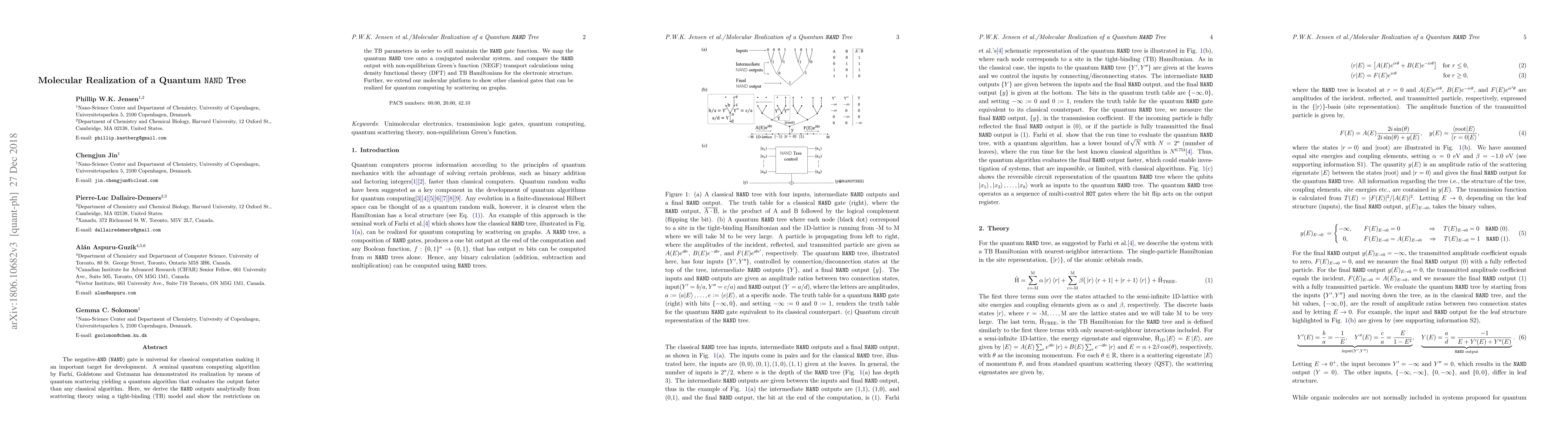 The negative-AND (NAND) gate is universal for classical computation making it an important target for development. A seminal quantum computing algorithm by Farhi, Goldstone and Gutmann has demonstrated its realization by means of quantum scattering yielding a quantum algorithm that evaluates the output faster than any classical algorithm. Here, we derive the NAND outputs analytically from scattering theory using a tight-binding (TB) model and show the restrictions on the TB parameters in order to still maintain the NAND gate function. We map the quantum NAND tree onto a conjugated molecular system, and compare the NAND output with non-equilibrium Green's function (NEGF) transport calculations using density functional theory (DFT) and TB Hamiltonians for the electronic structure. Further, we extend our molecular platform to show other classical gates that can be realized for quantum computing by scattering on graphs.