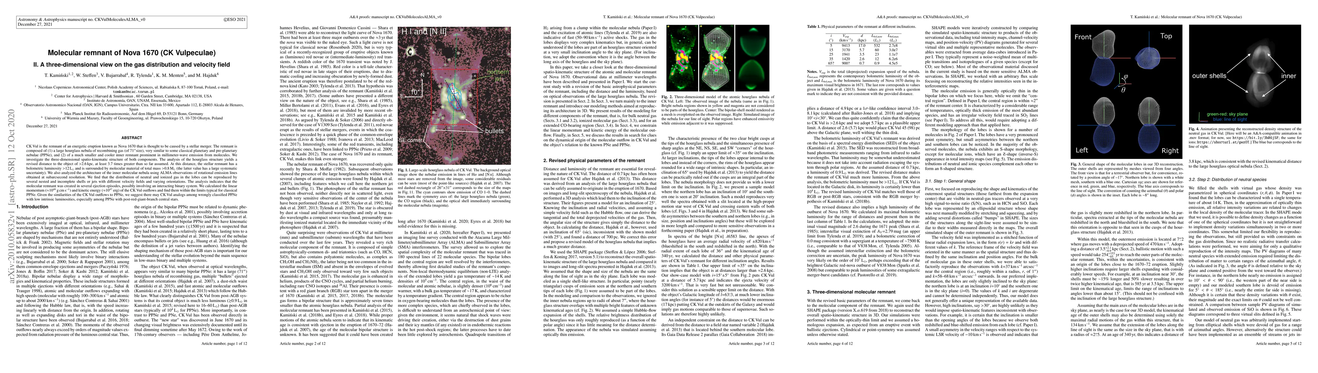 CK Vul is the remnant of an energetic eruption known as Nova 1670 that is thought to be caused by a stellar merger. The remnant is composed of (1) a large hourglass nebula of recombining gas (of 71\arcsec size), very similar to some classical planetary and pre-planetary nebulae (PPNe), and (2) of a much smaller and cooler inner remnant prominent in millimeter-wave emission from molecules. We investigate the three-dimensional spatio-kinematic structure of both components. The analysis of the hourglass structure yields a revised distance to the object of >2.6 kpc, at least 3.7 times greater than so far assumed. At this distance, the stellar remnant has a bolometric luminosity >12 L$_{\odot}$ and is surrounded by molecular material of total mass >0.8 M$_{\odot}$ (the latter value has a large systematic uncertainty). We also analyzed the architecture of the inner molecular nebula using ALMA observations of rotational emission lines obtained at subarcsecond resolution. We find that the distribution of neutral and ionized gas in the lobes can be reproduced by several nested and incomplete shells or jets with different velocity fields and varying orientations. The analysis indicates that the molecular remnant was created in several ejection episodes, possibly involving an interacting binary system. We calculated the linear momentum ($\approx$10$^{40}$ g cm s$^{-1}$) and kinetic energy ($\approx$10$^{47}$ erg) of the CK Vul outflows and find them within the limits typical for classical PPNe. Given the similarities of the CK Vul outflows to PPNe, we suggest there may CK Vul analogs among wrongly classified PPNe with low intrinsic luminosities, especially among PPNe with post-red-giant-branch central stars.