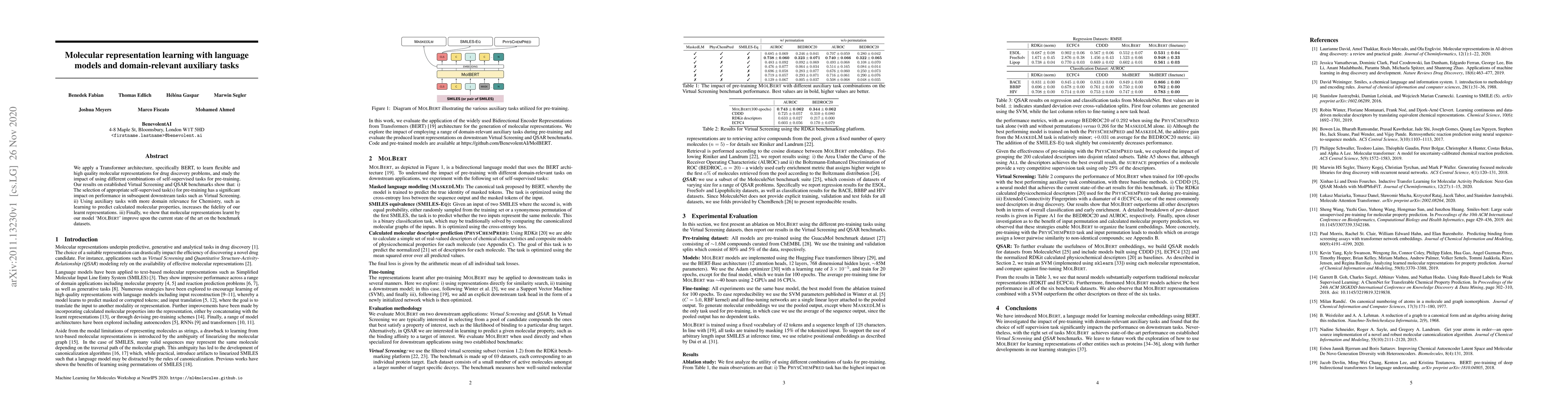 We apply a Transformer architecture, specifically BERT, to learn flexible and high quality molecular representations for drug discovery problems. We study the impact of using different combinations of self-supervised tasks for pre-training, and present our results for the established Virtual Screening and QSAR benchmarks. We show that: i) The selection of appropriate self-supervised task(s) for pre-training has a significant impact on performance in subsequent downstream tasks such as Virtual Screening. ii) Using auxiliary tasks with more domain relevance for Chemistry, such as learning to predict calculated molecular properties, increases the fidelity of our learnt representations. iii) Finally, we show that molecular representations learnt by our model `MolBert' improve upon the current state of the art on the benchmark datasets.
