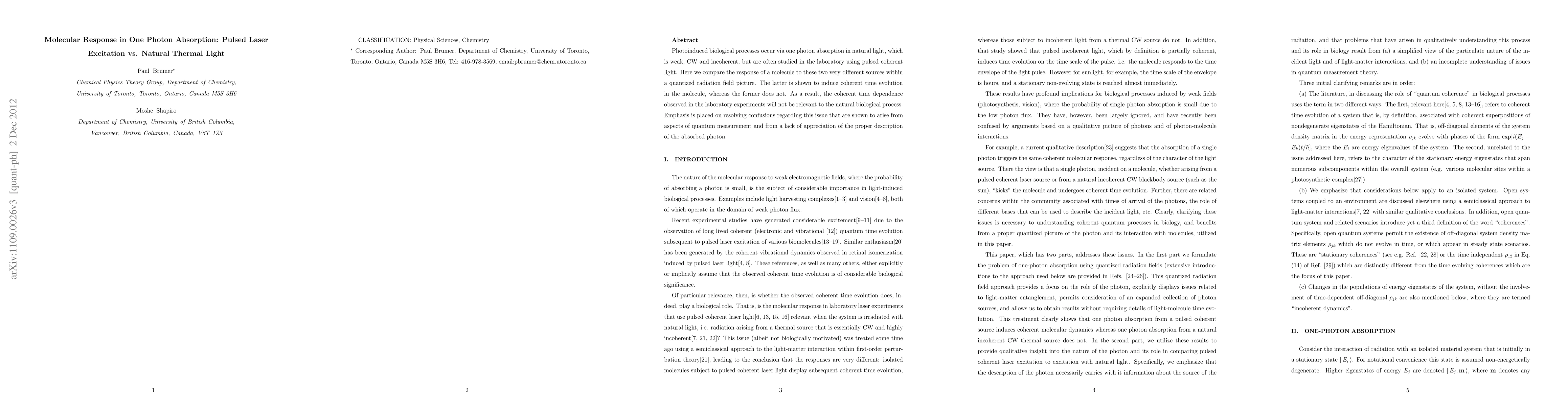 This paper compares molecular responses to one-photon absorption under natural thermal light versus pulsed laser excitation, revealing that coherent time evolution occurs with pulsed lasers, which does not happen with natural light, thus questioning the relevance of laboratory findings to natural biological processes. The study highlights the importance of understanding quantum measurement and photon description in these contexts.